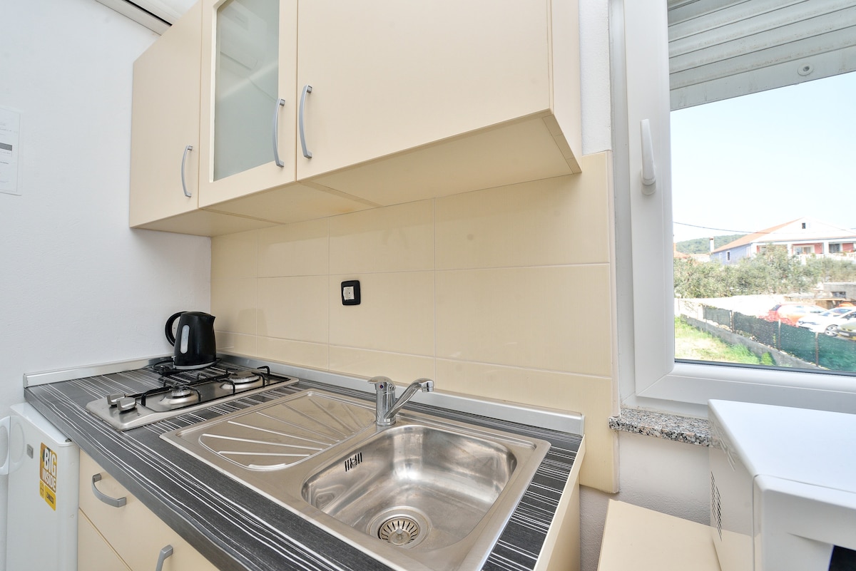 My apartment is brand new with all furniture and equipment. One bedroom with double bed and wardrobe, kitchen with all utensils for cooking, living room with sofa bed for two, TV, air condition..., bathroom with shower cabin. Apartment also has a beautiful terace, grill place, and parking space.