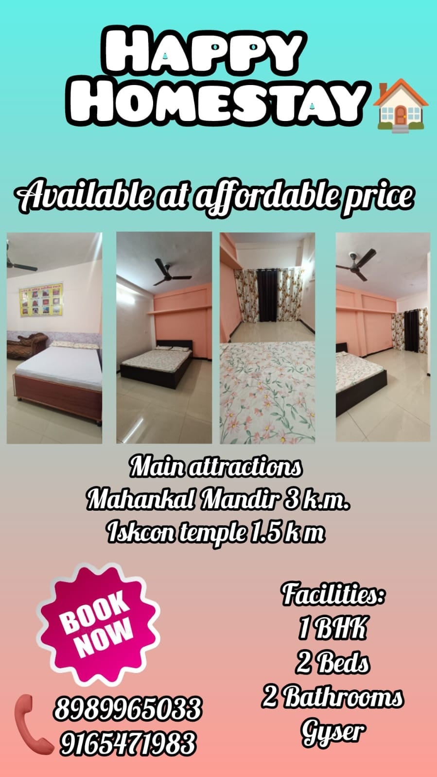 Welcome to Radha Rani Nivas – Spacious 2BHK Family Stay in Ujjain Located just 4.5 km from the famous Mahakal Temple and 1 km from Nanakheda Bus Stand, this peaceful 2BHK home on the first floor is perfect for families, friends, or spiritual travelers. Two spacious bedrooms, each with attached bathroom (Western style) Spacious rooms and private balcony to relax Ideal for groups, families, or long stays Restaurants within walking distance Safe and homely environment. Clean and mordern property