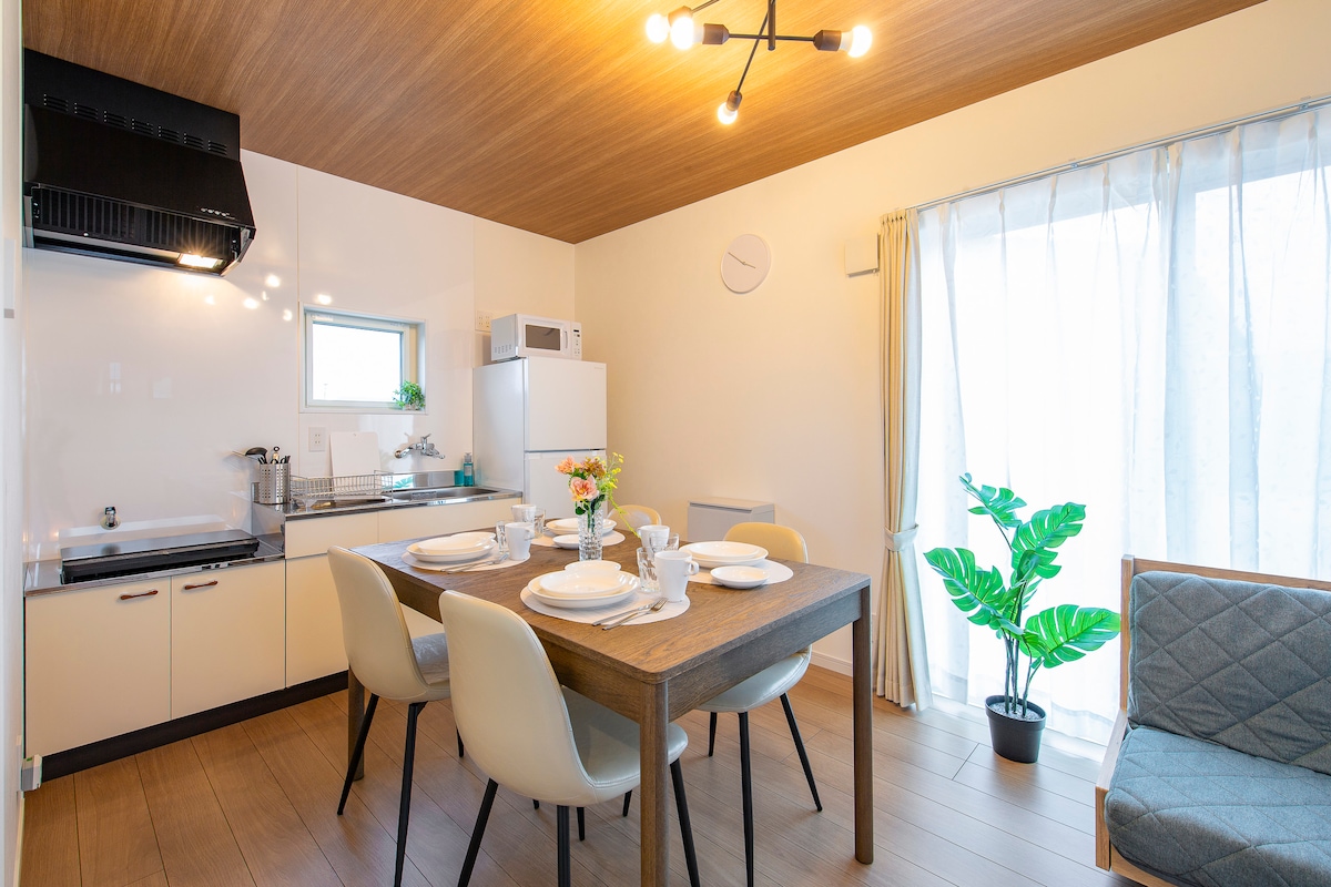 周囲は棚田と柿畑。日当たりも眺めも良く、そして静かです。 浮羽稲荷神社まで車で3分。星野村へも約10分でアクセスでき、 うきは市と星野村の山里巡りを楽しむための拠点としても最適です。 窓を開け放つとデッキとひと繋がりとなるキッチン、リビングダイニング。 家族や友人、1グループでBBQパーティーを楽しみやすい間取りとしました。 <キッチン用品> ◯電気炊飯器 ◯電気ケトル ◯冷蔵庫 ◯電子レンジ ◯オーブントースター ◯IHコンロ(1口) ◯ホットプレート(通常プレート・BBQプレート・たこ焼きプレート付き)◯お鍋(フライパン・鍋・深鍋)、◯カトラリー◯食器類 ○その他調理器具(包丁、まな板、トング、栓抜き、ワインオープナー) ◯調味料(塩、胡椒、ブラックペッパー、砂糖、醤油、みりん ※焼肉のタレ、ポン酢はありません)◯なたね油 <アメニティ> ◯ボディソープ ◯シャンプー ◯コンディショナー ◯歯ブラシ ◯ハンドタオル ◯バスタオル <その他> ◯Wi-Fi ◯エアコン ◯洗濯機(洗剤・柔軟剤自動投入)◯衣類乾燥機 ◯ウォッシュレット付きトイレ