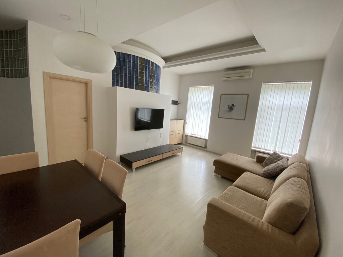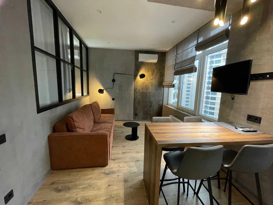 Loft style unique design apartment in Kamanina complex in Arkadia Odessa. One queen size bed in the bedroom and a sofa bed in the living room. (2+2) High floor with wonderful sea view, 500 meter to the beach and to the famous Arkadia city alley, full of clubs, restaurants, beach clubs, water and sport activities. There are coffee shops, restaurants, beauty salons, hookah bars, small grocery shops, a big supermarket and a post office at the complex. Yunist park is attached.