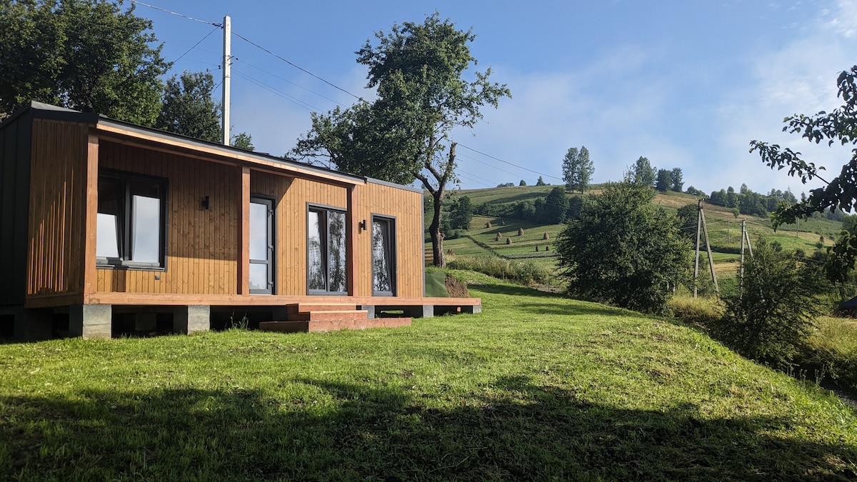 Новий просторий котедж для 2–4 гостей, без сусідів! • Окрема спальня з двоспальним ліжком та розкладним диваном в кухні студії Повністю обладнана кухня, зона відпочинку, ванна кімната • Wi-Fi, кондиціонер, телевізор, опалення, тепла підлога, безперебійне електропостачання! 🌞 Територіяз неймовірним видом на гори • Зона відкритого вогнища, гамак, гойдалка, мангал та зона барбекю • Паркування на території •
