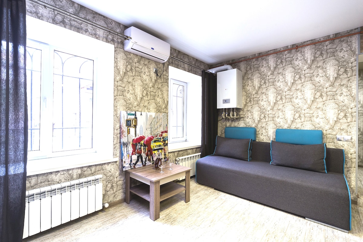 Cozy modern studio on the 2nd floor. The building is located in the center of Kyiv, near the Olympic Stadium, 5 minutes from the Olimpiiska metro station. The apartment has a queen-size bed and a sofa bed for two. The studio also has a small kitchen, bathroom and toilet with all the necessary amenities, TV, internet, etc. The studio is perfect for a comfortable stay for 4 guests or a family with children.
