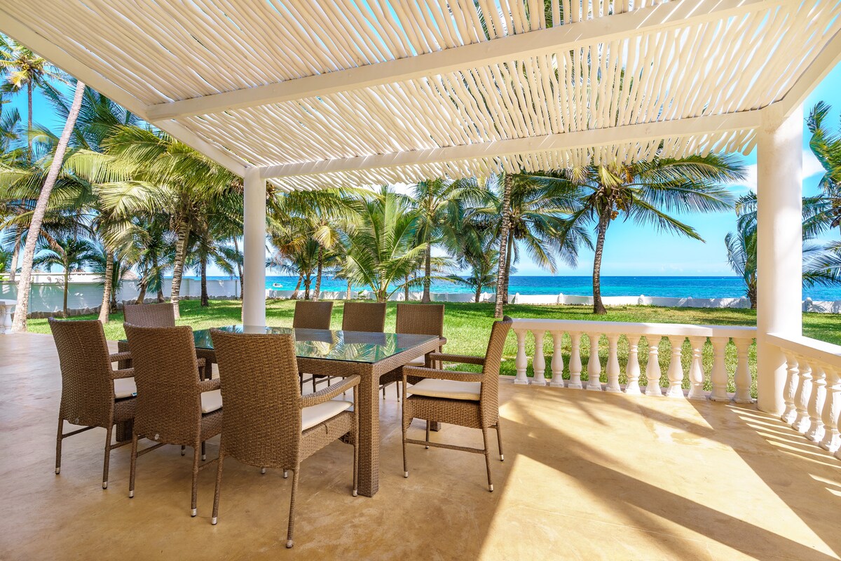 Steps away from the beach and nestled in a private & secure gated community, our gorgeous villa boasts Swahili architectural details, delicate woodwork, serene arches and a sweeping staircase with Kitengela stained-glass windows. With 5 magnificent ensuite bedrooms featuring Swahili beds, generous living areas and verandas, a lush mature garden with indigenous trees, main pool & baby pool, and a gazebo area with bar and BBQ grill, welcome to your perfect beach holiday!