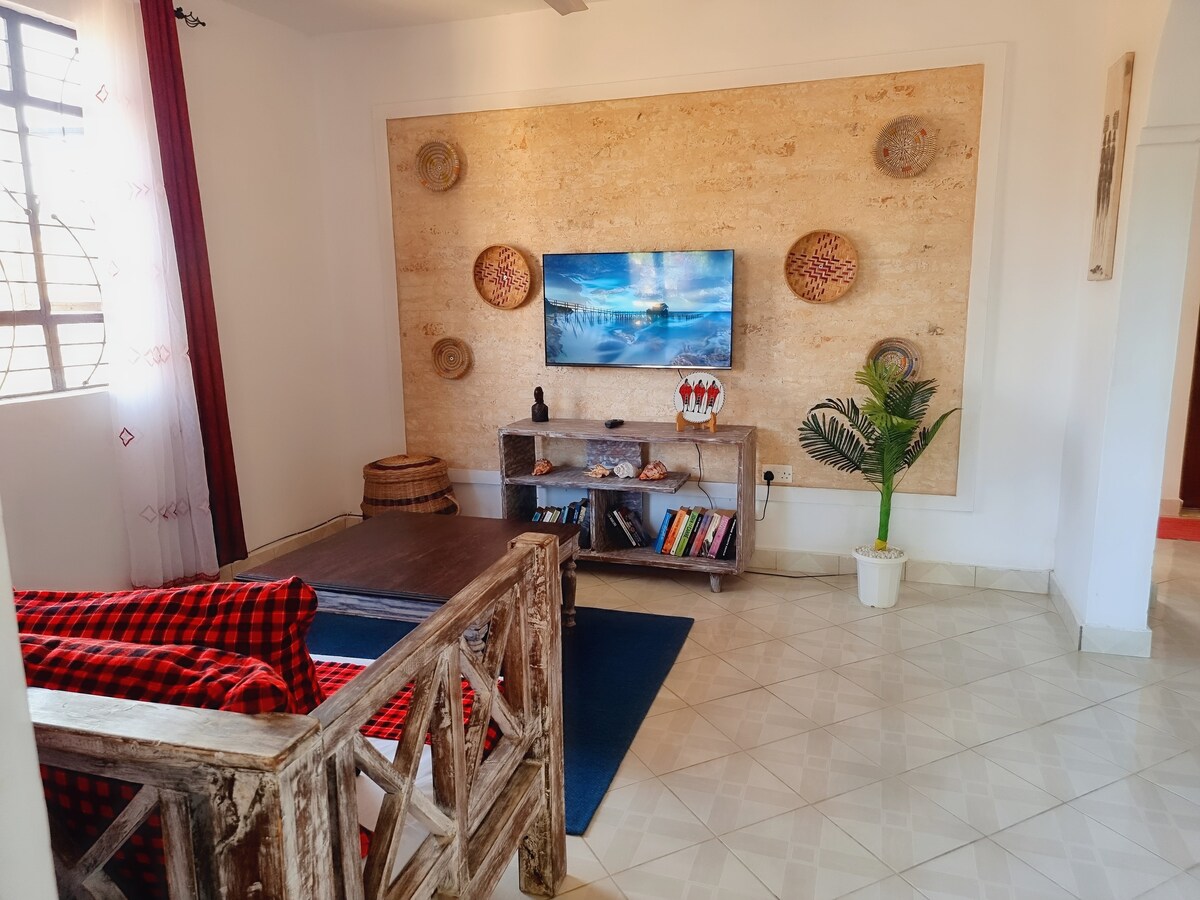 A simple, less is more interior decor 1bedroom house in Central Diani. Spacious, bright and perfect for short or long stays. A comfortable large sofa bed chair in the living room, flat screen smart TV, fast wifi and a dinning area that can be used as a study/work table. A fully equipped kitchen, queen size bed in the bedroom, a clean bathroom stocked with towels and toiletries. High roof with ceiling fans, extra standing fans, dehumidifier & large louvre glass windows for air circulation.