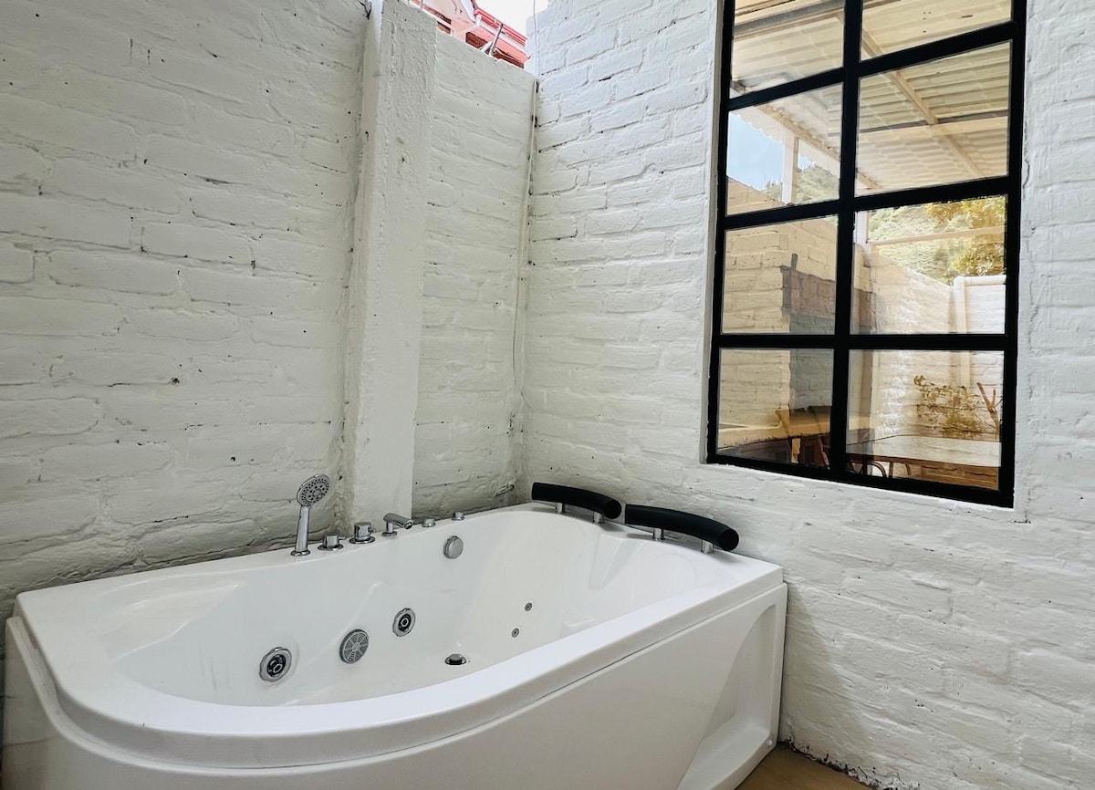 A quiet place to disconnect, 5 minutes from the center of Baños, this property is new, recently furnished, with floor-to-ceiling glass windows, it offers spaces to connect with nature. Modern and illuminated, it has an outdoor jacuzzi and outdoor terrace The master bedroom has a privileged view of the mountains and a few steps from the Chamana waterfalls High-speed fiber optic Internet is perfect for people who work remotely.