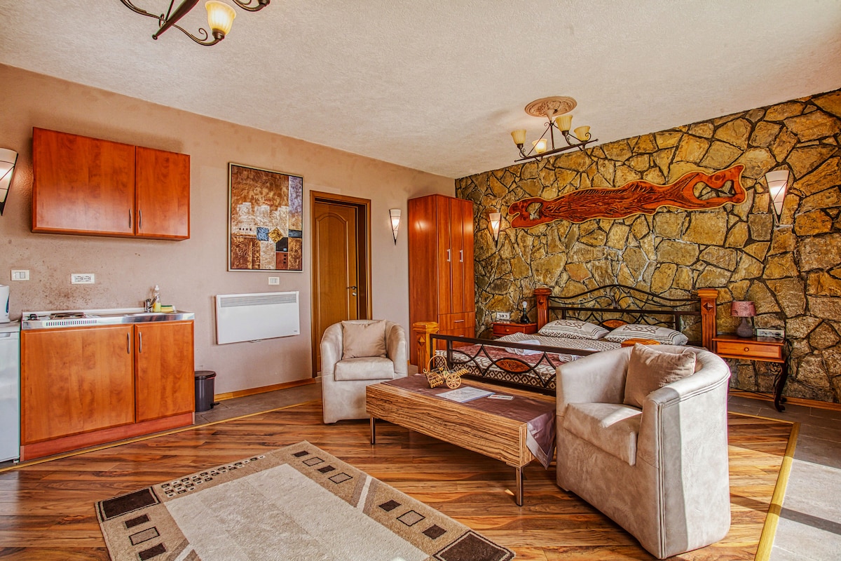 The Boohoo Stylish studio apartment with panoramic views provides a related bedroom with living room 30 meters square. This apartment is modern and very comfy. You have a big kitchen fully equipment ,dinning table, flat screen TV, AC, Wi Fii, sofa bed , bathroom with shower and its more important you can enjoy the sun set views from the balcony.