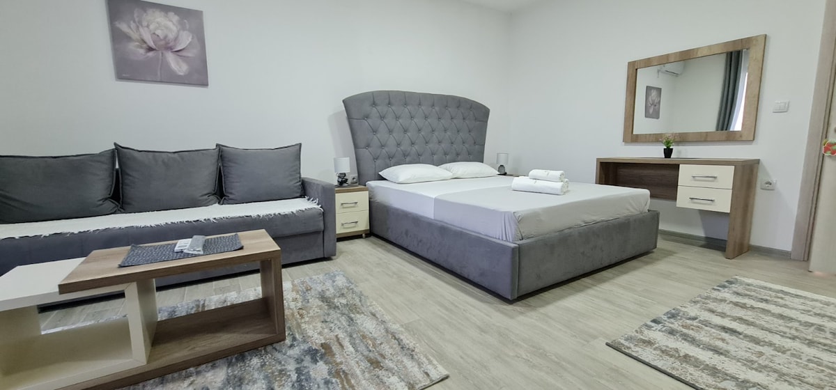 Britannia Apartments - Luxury 1 & 2 Bed Apartments By The KALAJA And Small Beach, Ulcinj, all apartments with Sea views, Kitchen, Bathroom & Balcony. This listing is for apartment 2 which is a studio Apartment with 1 double bed and is suitable for 2 people.