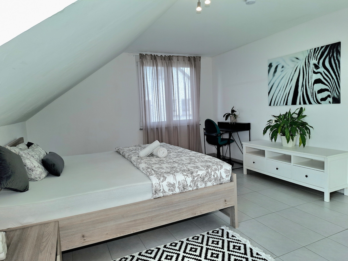 SecondHome Stuttgart: Super zentral gelegen im schönen mittelalterlichen Esslingen a.N. Modern eingerichtete große Ferienwohnung 5min von der wunderschönen Altstadt von Esslingen entfernt, mit 4 Schlafzimmern, 11 Betten, 2 Bäder, heller Wohnküche mit großem Essbereich und Parkplatz. Ideal für Einzelzimmernutzung (häufig bei Messegästen) oder auch größeren Gruppen für bis zu 8 Personen.