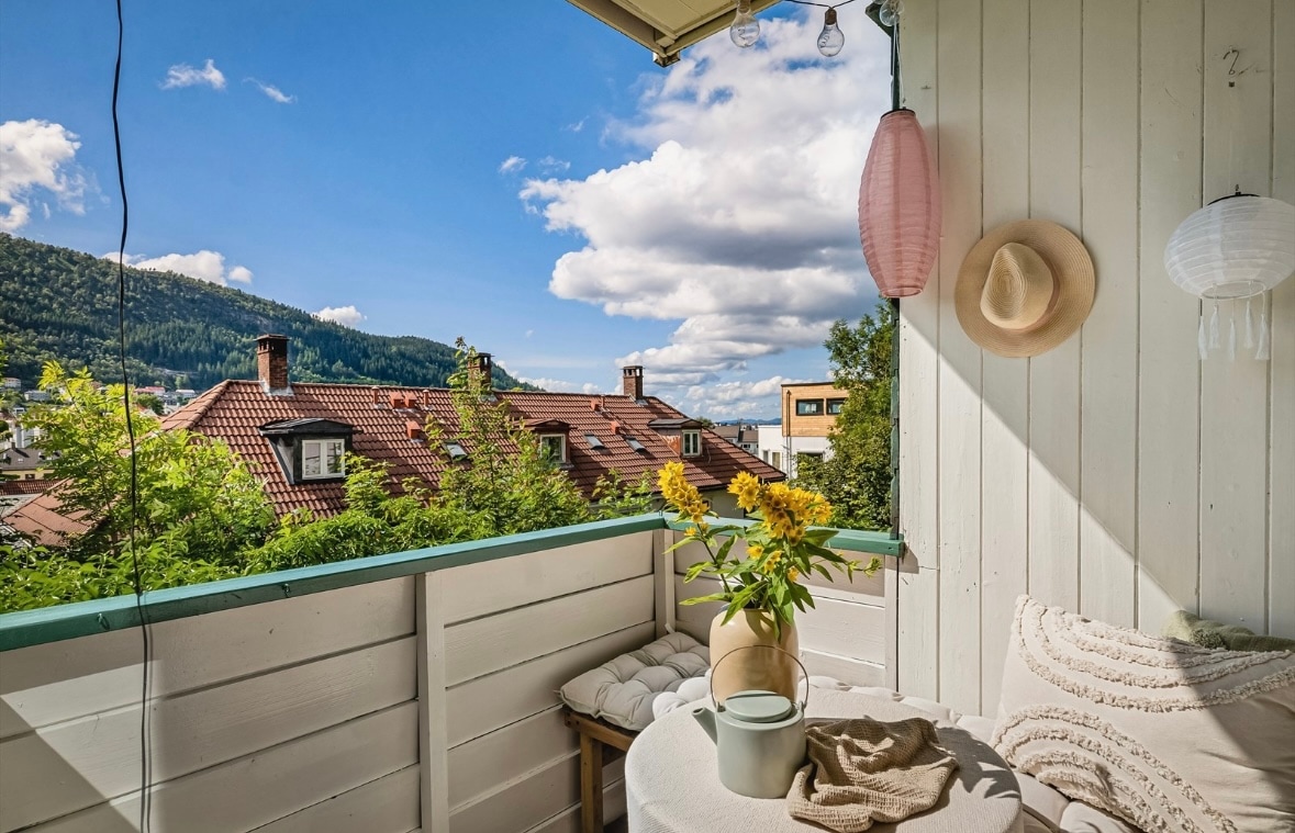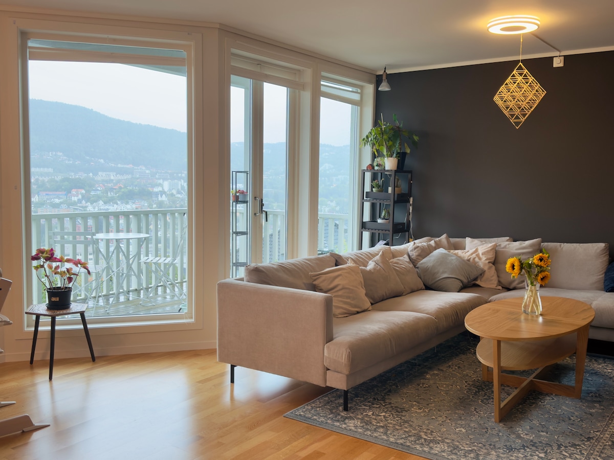 Lekker toppleilighet med høy standard i 6. etasje. Fin utsikt, privat terrasse og stor terrasse med 360 graders utsikt. Heisadkomst. Meget sentral beliggenhet med gangavstand til Bryggen, restauranter, pub, museum, park, badestrand. Umiddelbar nærhet til togstasjon. Bergen light rail med direkte adkomst fra flyplassen. Dagligvarebutikk i nabobygg. 50 meter til nærmeste parkeringsplass og 300 meter til p-hus. God planløsning med 2 soverom og 2 baderom! Vaskemaskin og tørketrommel til fritt bruk.