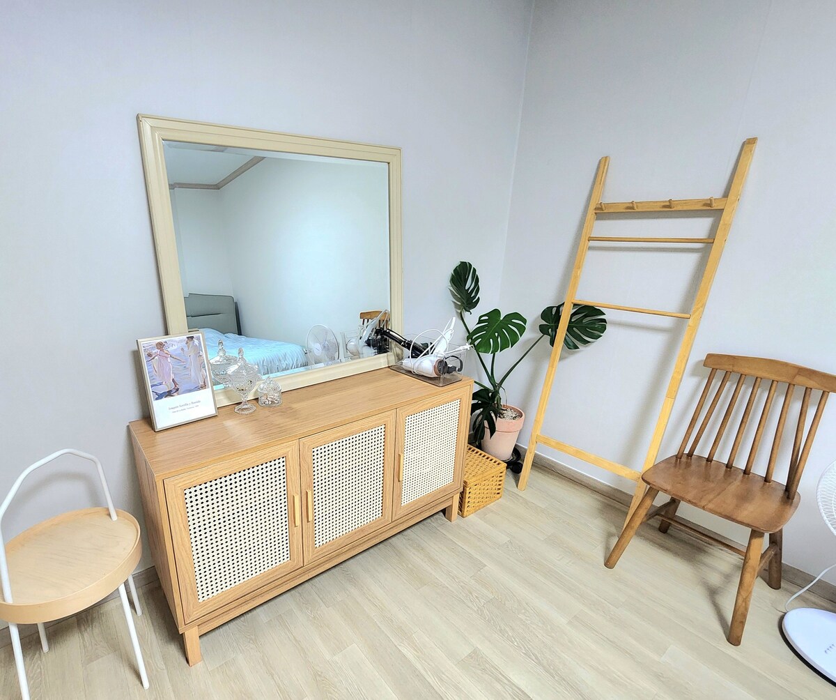Hello, it is located in Songjeong district of new city, 5 minutes drive from Ulsan Airport. It is a clean and spacious house with three high ceilings. It is a new building, and everything is equipped with new products. There is a terrace on the back of the hotel where you can freely barbecue.