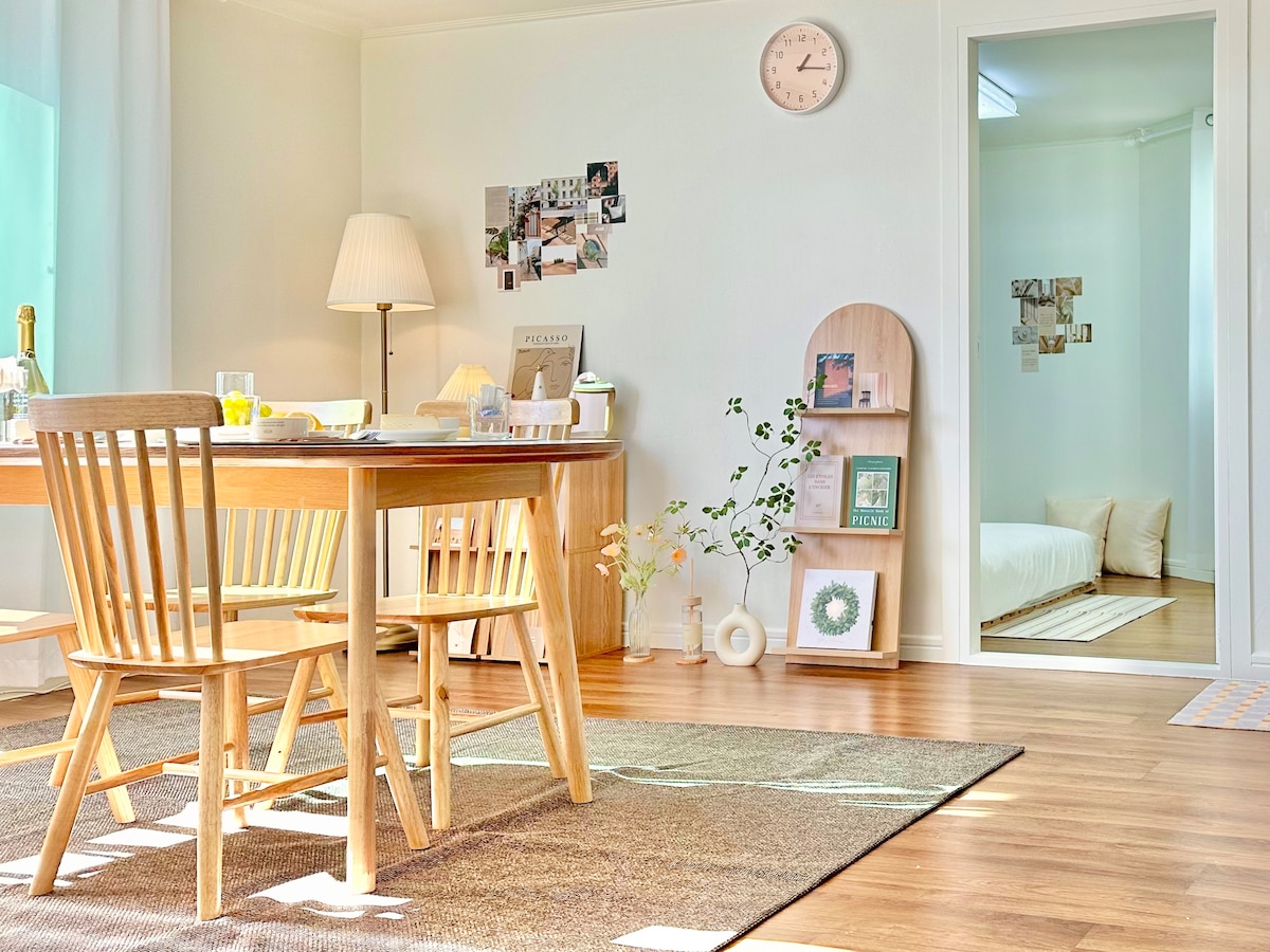 **ESCONDITE 🧚🏻♀️ 에스콘디테:숨바꼭질할때 숨는 곳.,,** 💕인스타: ‘에스콘디테’로 검색 DM 문의 주셔도 됩니다💕 💕울산에서 가장 번화가인 달동에 있어요💕 걸어갈 수 있는 모든 곳에 핫플이! 백화점도 걸어서; 하지만 숙소는 조용🧚🏻♀️ *연박할인있어요(문의먼저^^) *넓은 거실과 독립적인 침실 두개 :퀸사이즈 침대 *최대 정원은 6명^^ 4명 초과 예약이실경우 매트리스토퍼를 세팅해드립니다. *원목을 기본으로 한 차분한 인테리어 빔프로젝터와 넷플릭스 디즈니플러스 유튜브. 2미터의 커다란 원목 테이블. 초록의 플랜테리어로 편안하고 우아한 쉼을 하실수 있어요~ *요리는 안되요.(오래 머무시거나 특별한 사정이 있으시면 말씀해주세요^^) 몇 걸음만 걸으시면 맛집들이 즐비해 있답니다^^ 배달음식도 늦게까지 주문+매우 빨리 도착~ *하지만! 멋진 테이블 세팅을 위한 다양한 그릇과 잔들이 준비되어 있어요.(테이블세팅에 진심인 호스트^^)