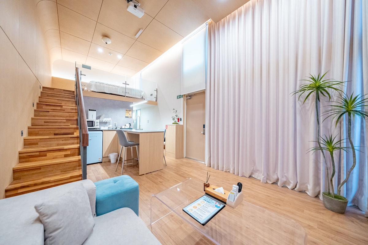 침실과 거실이 구분되어 있으며 조리가 가능한 인덕션, 전자레인지, 세탁기, 냉장고 등 편의 시설이 구비되어 있습니다. 또한 무료헬스장이 이용가능하며 태화강의 멋진 뷰를 객실내에서즐기실 수 있습니다.