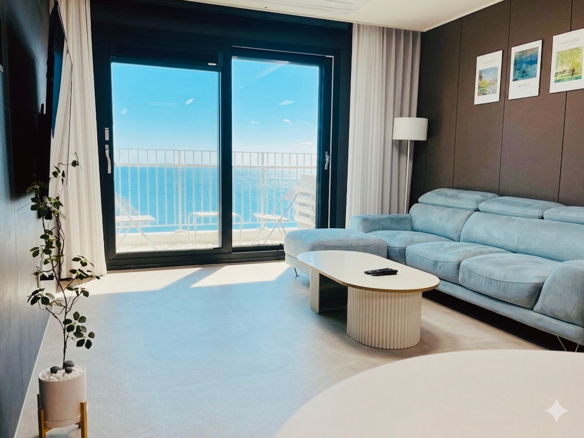 ✨️ 거실창을 열면 바로 테라스로 이어져 바다뷰를 즐길 수 있습니다. 소파에서 쉬다가 창문을 열고 나가면 바로 테라스에서 바다를 느낄 수 있어요. 단순히 창으로 보는 뷰가 아니라 밖으로 나가 직접 즐길 수 있는 점이 다릅니다. 퀸 침대 2개 + 킹침대, 여유로운 동선과 욕실로 가족이나 친구들과 머물기 좋습니다. 테라스에서는 윤슬의 눈부심없이 편안한 눈으로 오션뷰를 즐기고 휴식하기 좋습니다. Open the window and step out to the terrace to enjoy the ocean right away. 🐳부산 해운대구청 및 미스터멘션 특례를 적용받아 내외국인 공유숙박 합법 업체로 등록되어 운영되고 있습니다.