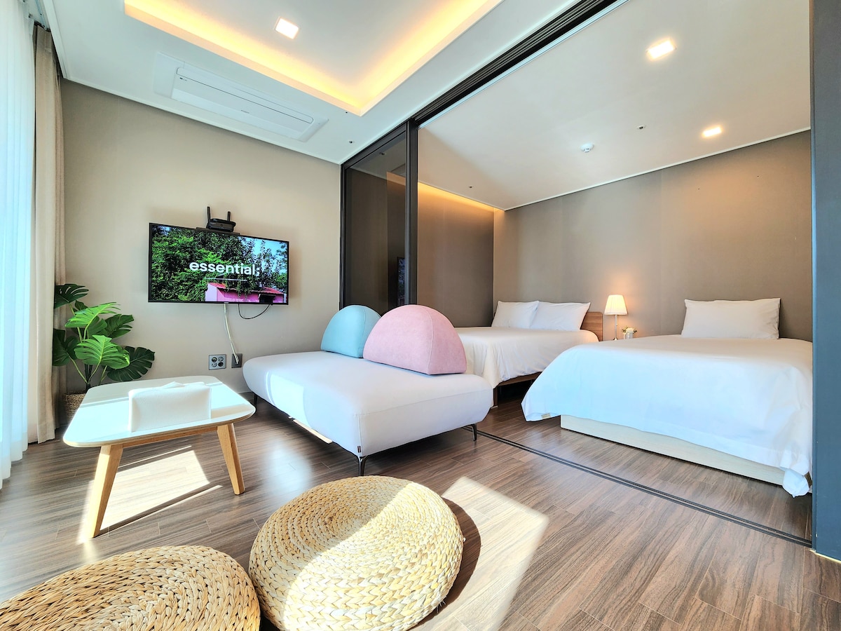 Only 10 seconds to get to the Songjeong beach best for surfing! Great ocean view & bigger room than the others * Check-in : 3 pm ~ / Check-out : ~11 am * Left luggage before check-in : Available at front from 11 am * Laundry machine, refrigerator, microwave, induction range, electric kettle, wine opener available * Cooking available in the room * Free parking available * Please put back items after use * Please ensure refund policies before making reservation