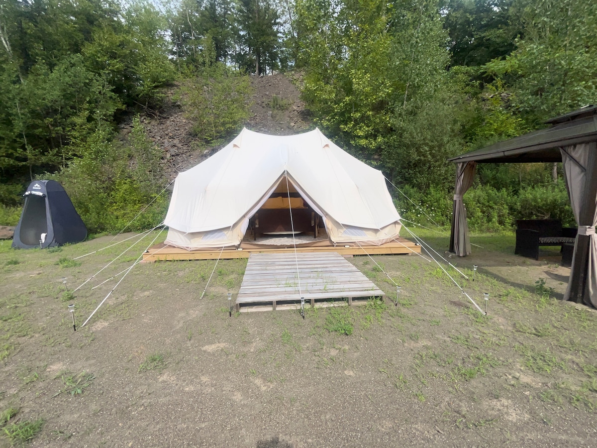Year-round private Catskills glamping site with stunning sunset views, come stay on an incredible lakefront property nestled in the hills of Sullivan County. Our 16’ 4-season canvas bell tent features wood burning stove, running water, and comfortably sleeps two with a queen sized bed.