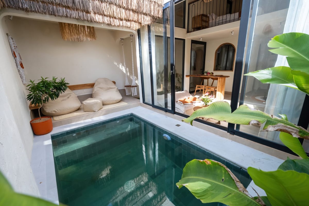 Discover a charming tropical escape at Casa Pumara, a stylish mezzanine villa with your own private plunge pool. Designed with warm natural wood, elegant arches, and beautiful natural light, the space offers a cozy yet sophisticated atmosphere. Relax on the swing, unwind in the sunken living room, or enjoy a peaceful moment by the pool surrounded by tropical greenery. Perfect for couples or travelers looking for a unique and relaxing Bali stay, conveniently located near Kerobokan and denpasar.