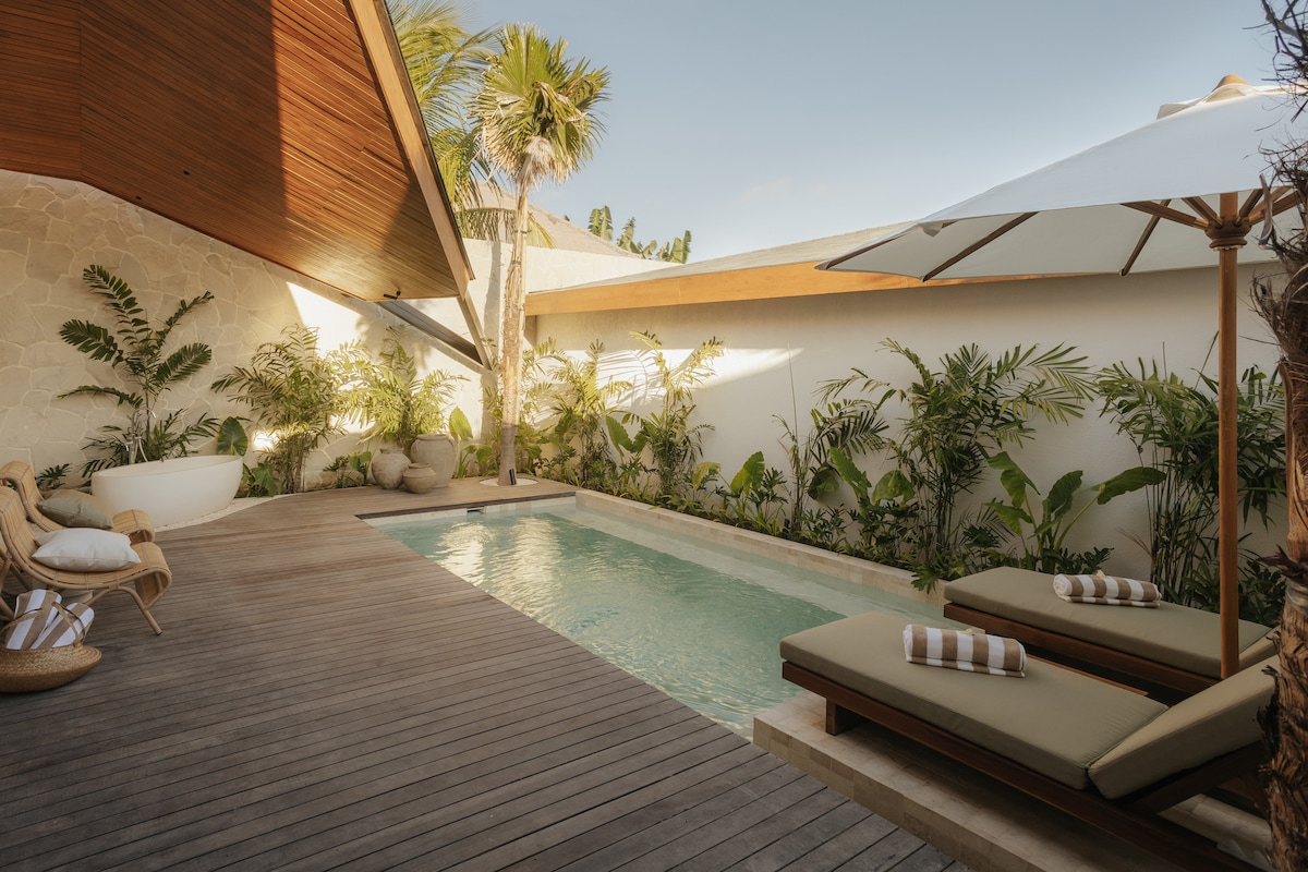 Your tropical retreat at Nori 1-Bedroom Villa, Enjoy a cozy bedroom with en-suite, a spacious open living area, and your own private pool embraced by greenery. Lounge outdoors, soak up the sun or stargaze from the rooftop terrace, and relax in bright, airy spaces with natural light and high ceilings. Perfect for couples craving romance and quiet luxury, or solo travelers who want peace, privacy, and a true reset in Uluwatu.
