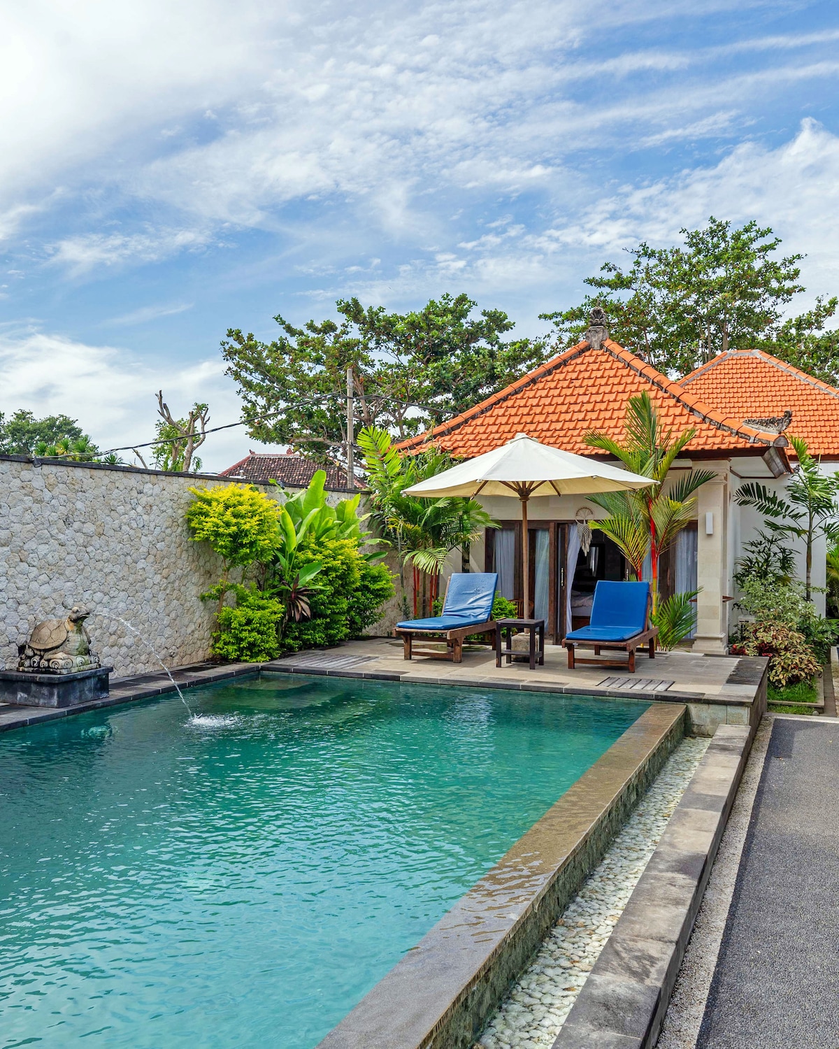 Our wooden cabin adopts the traditional Balinese Lumbung style, inspired by rice granaries and crafted with natural wood. Designed simply yet charmingly, it combines classic architecture with modern comfort — a perfect tropical escape from the crowd. Enjoy your private cabin with AC, ensuite bathroom, terrace, and access to the shared swimming pool, while experiencing authentic Balinese living in South Kuta near Nusa Dua and Uluwatu’s famous beaches.