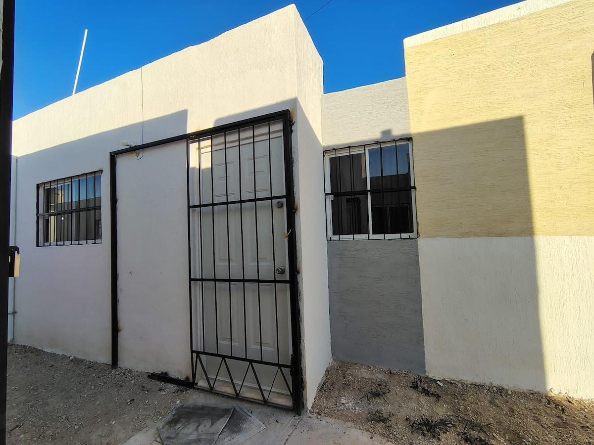 Ideal para personas que deseen vacacionar o trabajar, tanto para estancias cortas como largas. La casa se encuentra en un nuevo fraccionamiento al poniente de la ciudad con todo lo básico e indispensable para una agradable estancia: A/A, cocina equipada, wifi, agua caliente, espacio para 1 auto. El transporte público pasa a 1 cuadra. En auto está a 10min aprox del aeropuerto internacional, a 25 min aprox del centro histórico, a 10min aprox de Caucel y Umán. **Aceptamos mascotas y facturamos**