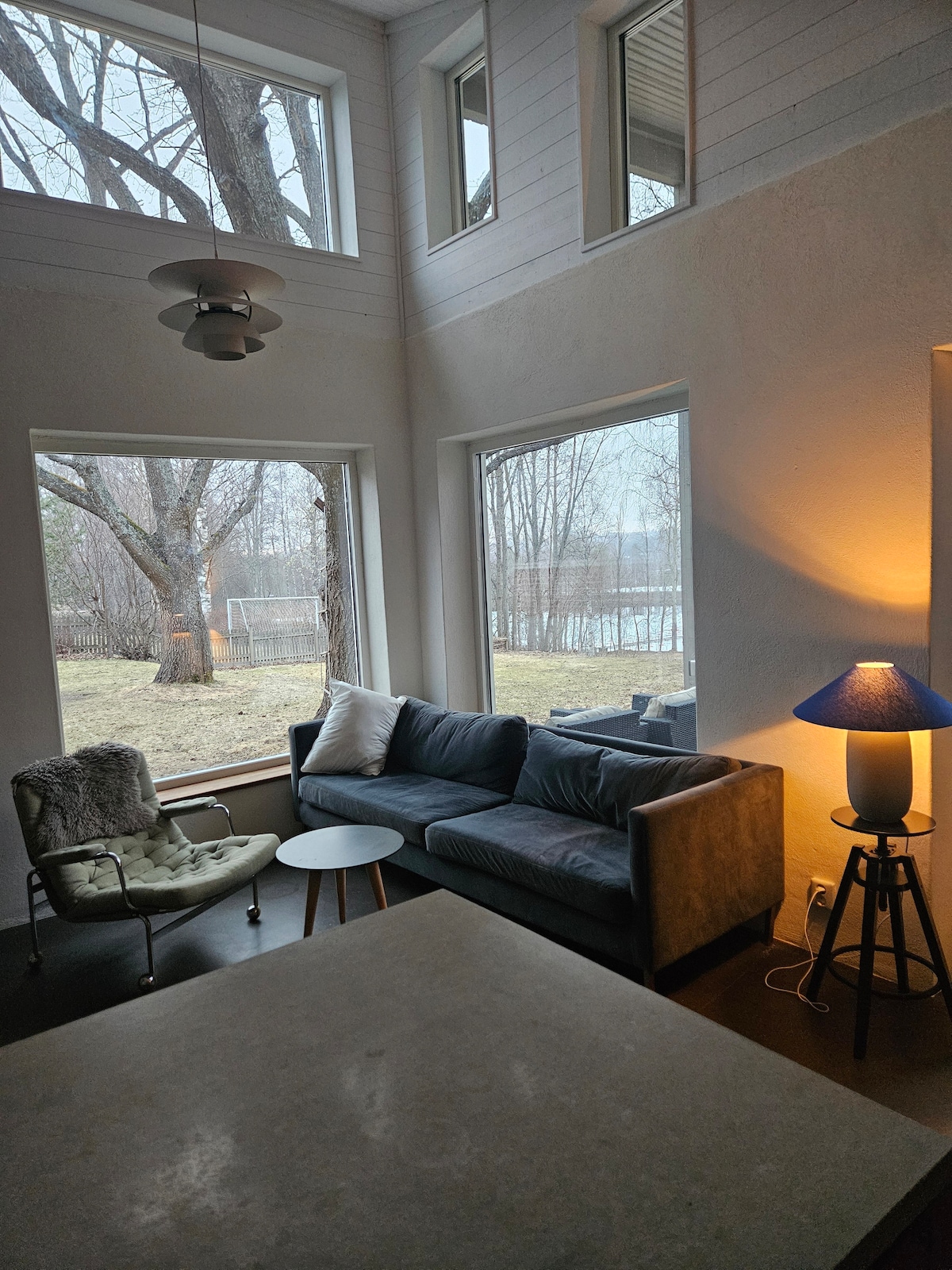Lergrova小屋、壁炉、河流和森林。