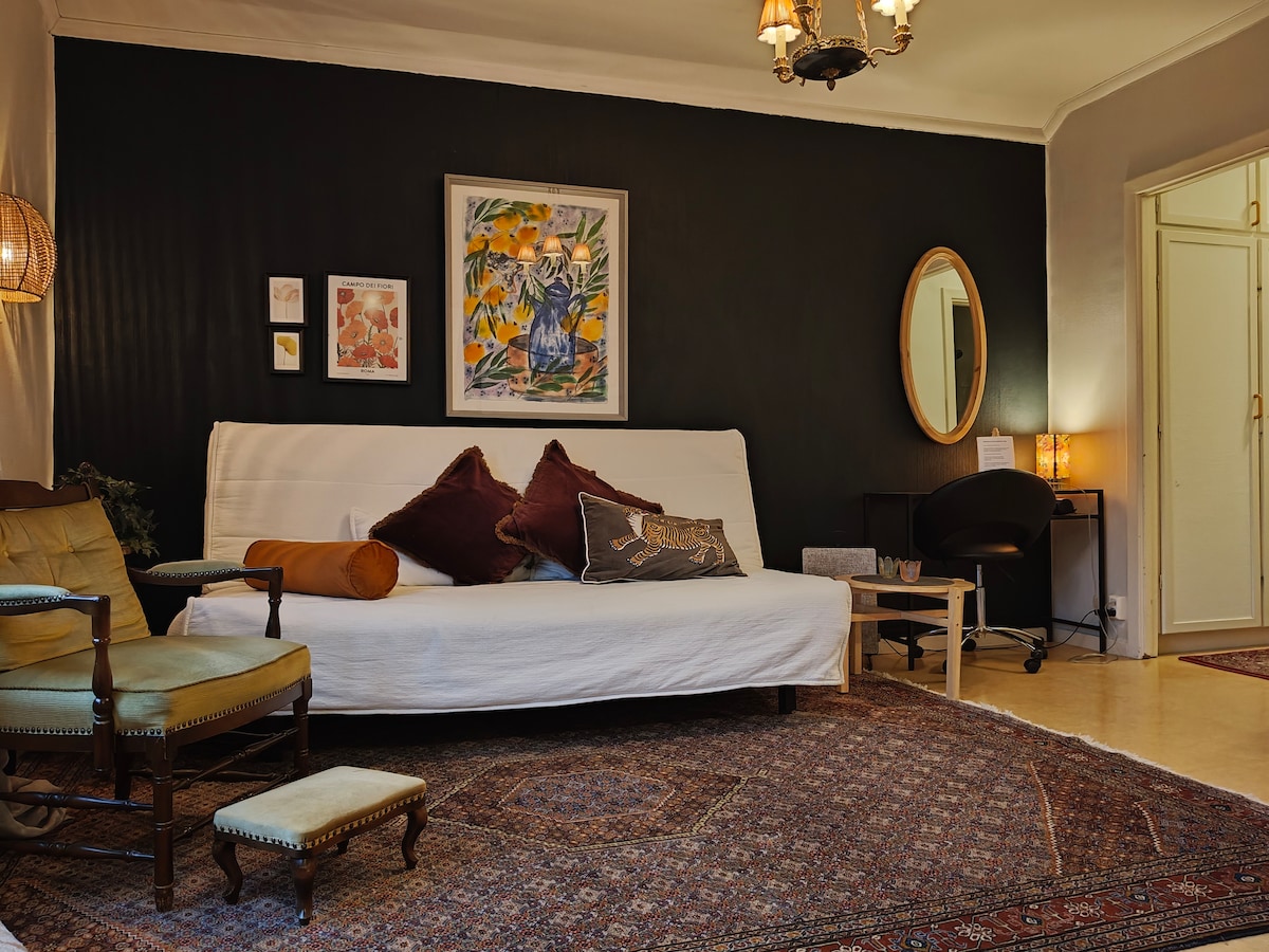 Nära till allt i detta fridfulla och centralt belägna boende. Trevligt litet boende med det mesta som behövs för en trivsam vistelse. Lägenheten har en hall med garderober, vardagsrum och sovalkov. Kokvrå med spis ugn och kyl/frys. Eget badrum med dusch toalett och badkar. Bara ett stenkast från stadskärnan, endast några minuters promenadväg till Centralstationen och stadens nöjen och shopping. Perfekt om man värdesätter närheten till centrum men samtidigt vill ha ett tyst och lugnt boende.