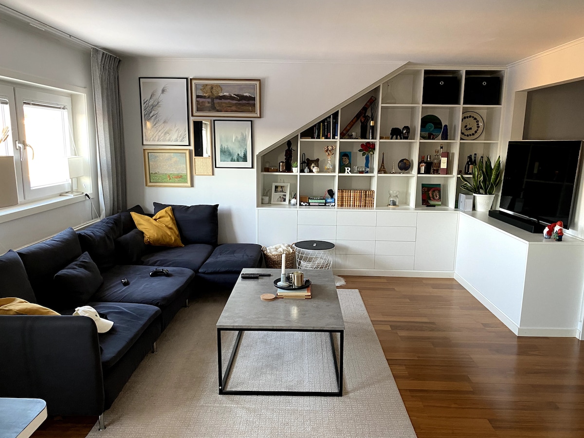 Vi erbjuder en ljus och nyrenoverad vindsvåning på ca 30 kvm. Lägenheten är inredd med de bekvämligheter som krävs för ett bekvämt boende för upp till två personer. Mysigt kök med ny kyl/frys, spis och ugn samt micro med köksartiklar. Nyrenoverat badrum. 160cm säng, sittsoffa samt en fotölj. 55" smart TV, WIFI. Lägenheten har smidigt kodlås för er bekvämlighet. Gästen ansvarar för städning innan utcheckning. Er host bor i samma hus och är tillgängliga vid frågor.