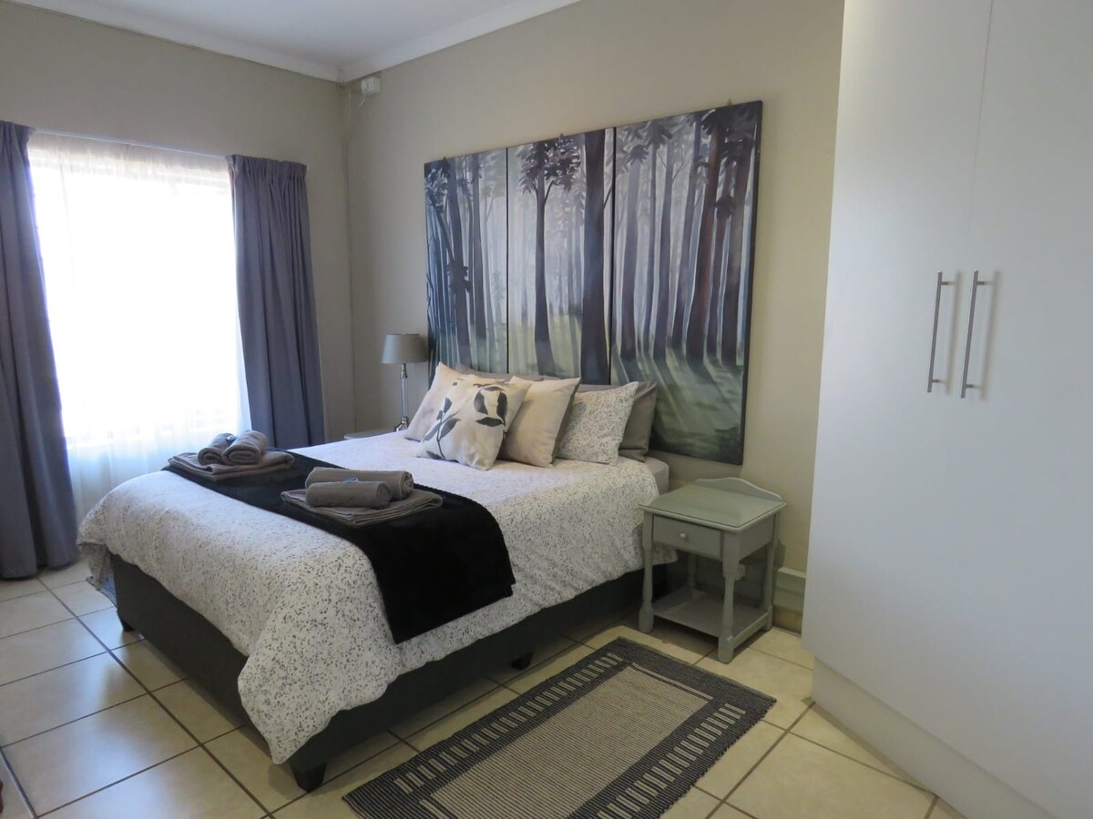 Enjoy easy access to main routes from this perfectly located home base. Self - Catering 2 bedroom - the main bedroom has a Queen Size bed and the 2nd bedroom has a 3/4 bed. Close to shops and tourist spots. Secure, undercover parking. WI-FI and TV. Air conditioning in main Bedroom and open plan living space. Outdoor entertainment area.