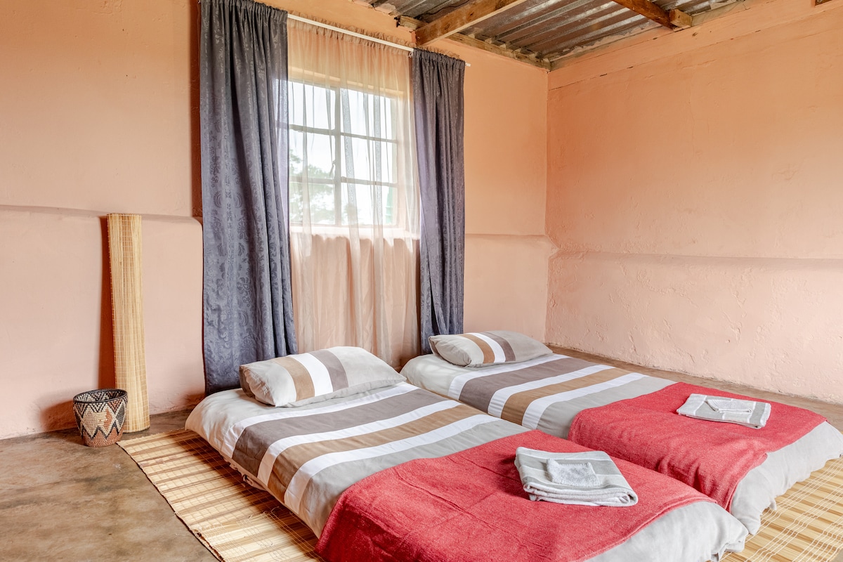 Main Lodge is the living area, bedrooms are 3 separate chalets. Our Lodge is a haven to unwind, close to family-friendly activities. Be at one with nature, experiencing wildlife up close, a unique bush experience. Enjoy a stress free time out with your family or solo. The game park is ideal for tranquil self-guided walks and excellent birding opportunities on the numerous walking trails. Enjoy a cocktail under the trees at the firepit and star gaze while taking in the bush view to end your day.