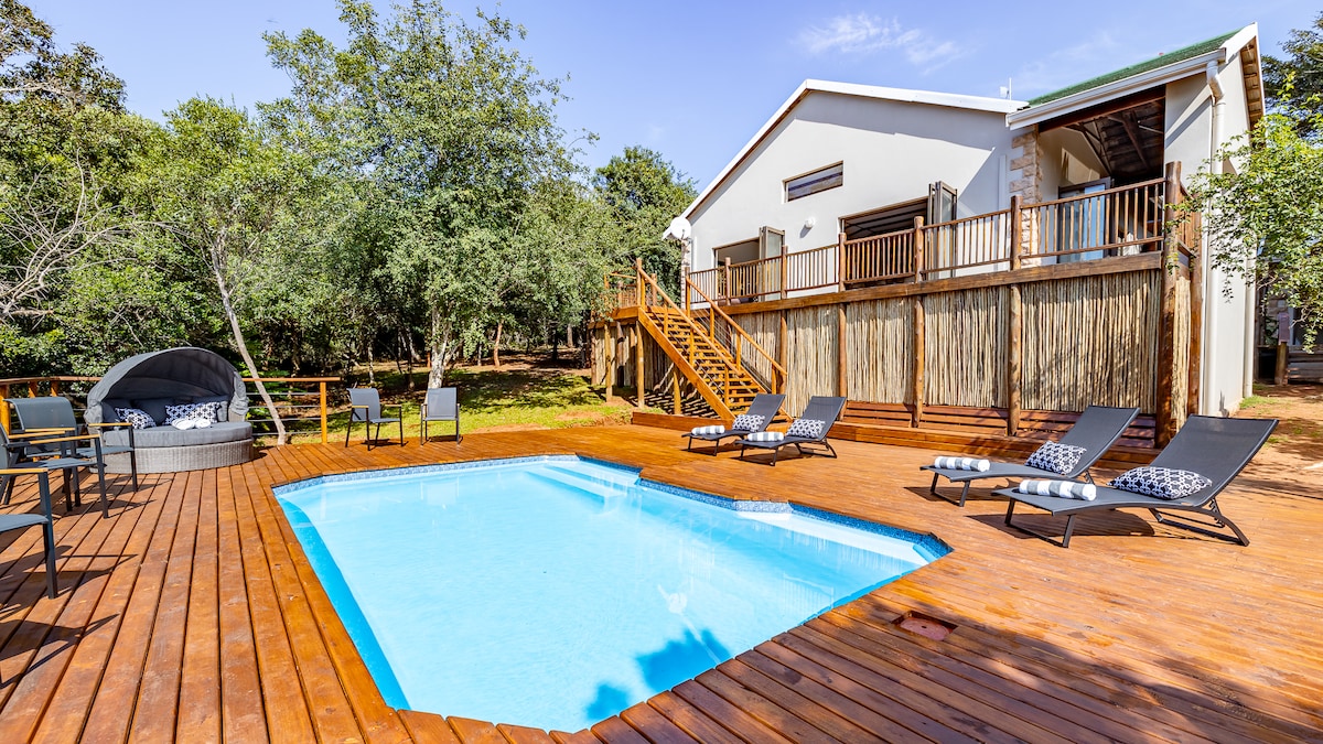 Tchagra House is a Self-catering, fabulously comfortable, spacious home. You get the entire house and garden to yourself. The home is within Kuleni Game Park, near Hluhluwe, Northern KZN. View wildlife from the stunning veranda. There is a Swimming Pool near the house. Enjoy the most gorgeous sunsets. The night sky is a star-gazers delight! Also take a look at our other accommodation option also within Kuleni ... 'Chumbi House'.