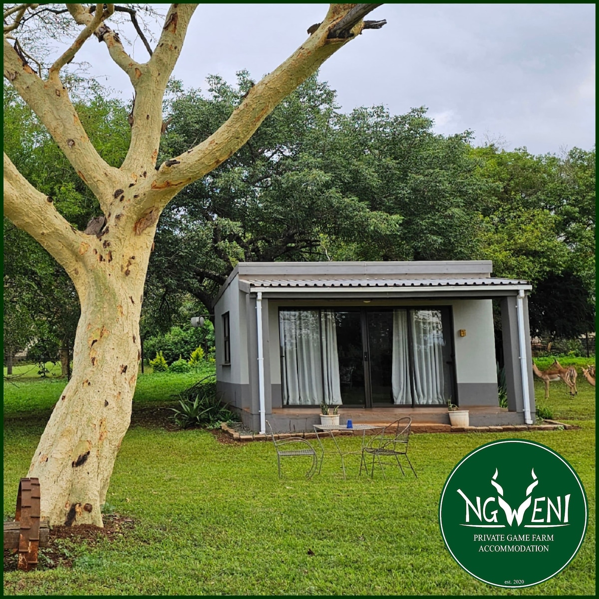 Main Lodge is the living area, bedrooms are 3 separate chalets. Our Lodge is a haven to unwind, close to family-friendly activities. Be at one with nature, experiencing wildlife up close, a unique bush experience. Enjoy a stress free time out with your family or solo. The game park is ideal for tranquil self-guided walks and excellent birding opportunities on the numerous walking trails. Enjoy a cocktail under the trees at the firepit and star gaze while taking in the bush view to end your day.