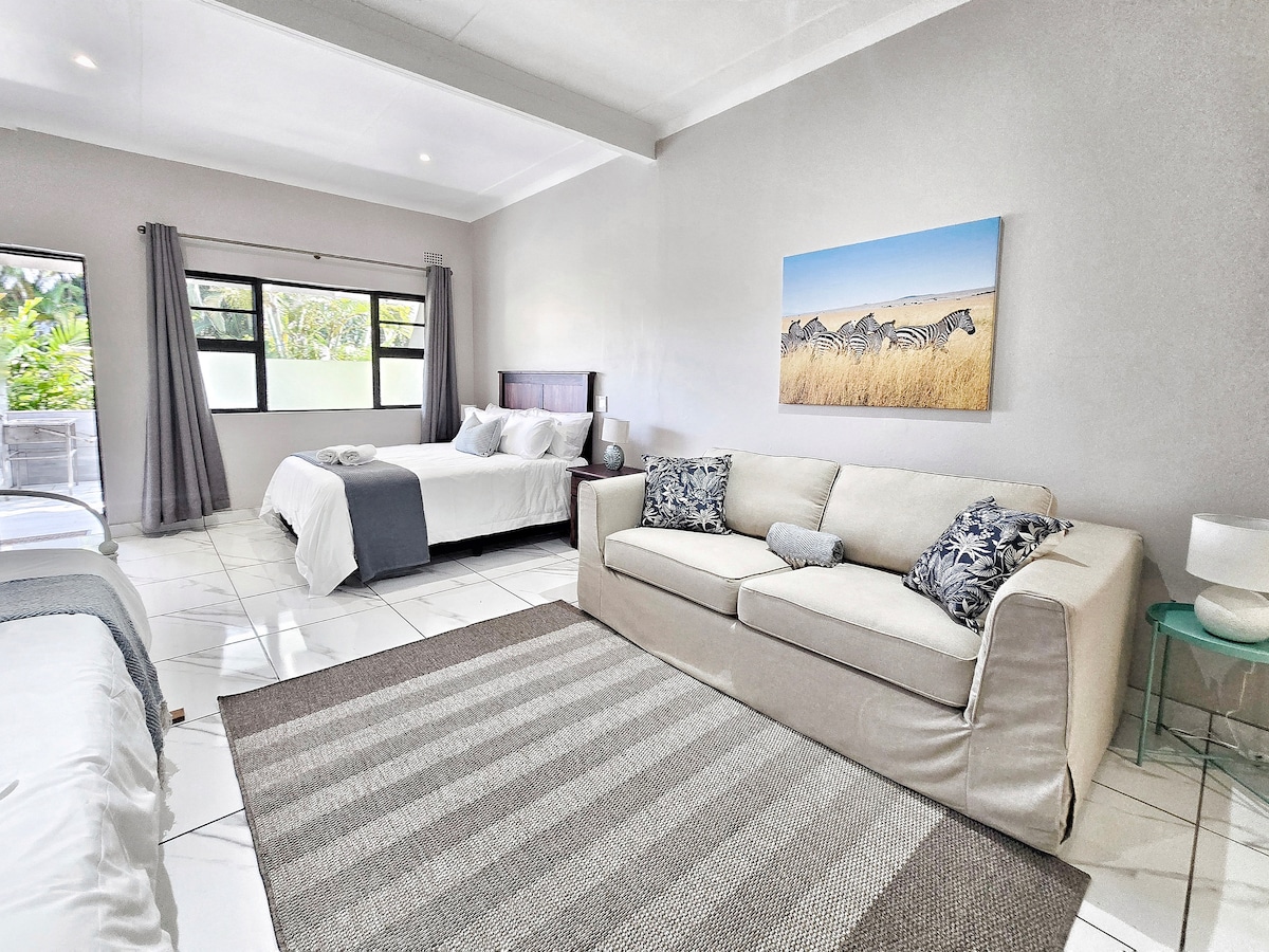 We are unaffected by load-shedding due to our newly installed, fully operational solar power system. The unit is self-catering with all you require for a comfortable stay. King size bed in the bedroom with en-suite bathroom. Additional single bed in room. Aircon in unit. Kitchenette has fridge, microwave, induction cooker, small oven, kettle, toaster, and basin. Small two-seater table inside. Covered patio with comfy chairs in tropical garden with shared pool.