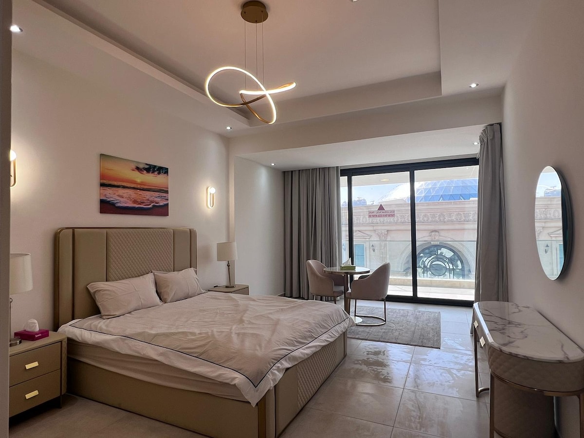 Welcome to "Skyline balcony retreat" your ideal escape nestled in a tranquil setting. This charming studio offering a perfect blend of luxury and affordability, With a view of madina central along with private balcony, SPA and beach access. Below are included: -24/7 security and concierge service. -Gym, Swimming pool, Kids play area, Steam room, Jacuzzi & Spa -Hand soap, Body soap, Shampoo, Bed sheet & Fresh towels. -Free drinking water -Free WIFI..