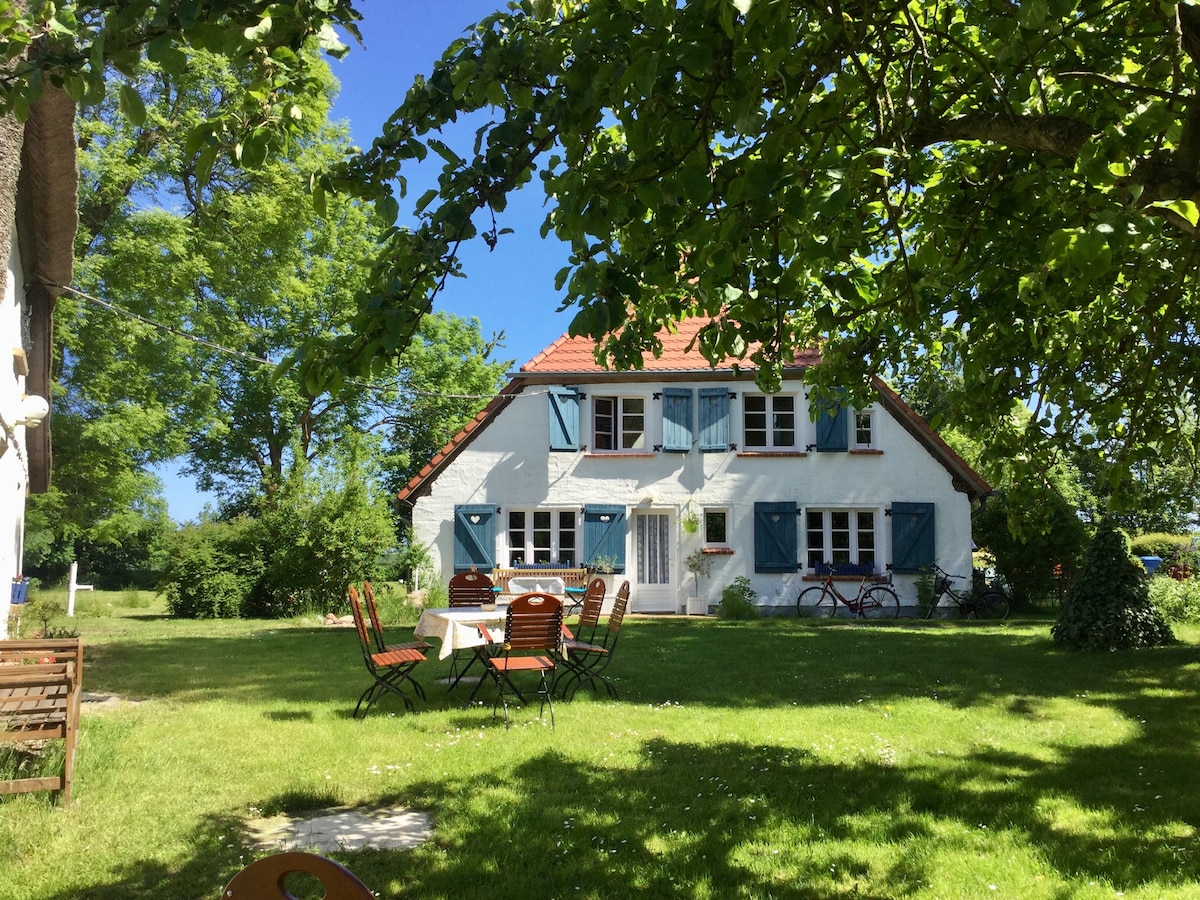 Wir vermieten unser gemütliches, stilvolles Ferienhaus im ruhigen Westen Rügens. Unsere Tochter nennt es "Familienkate Schwalbenflug", und das passt. Ihnen stehen 4 Schlafzimmer für Erwachsene und Kinder zur Verfügung. Das Haus wurde bis 2020 gründlich saniert, verfügt über eine moderne Küche und zwei schöne Duschbäder, eine Sitzecke mit Kamin und eine Terrasse mit Blick auf Reiterhof und Pferdekoppel.