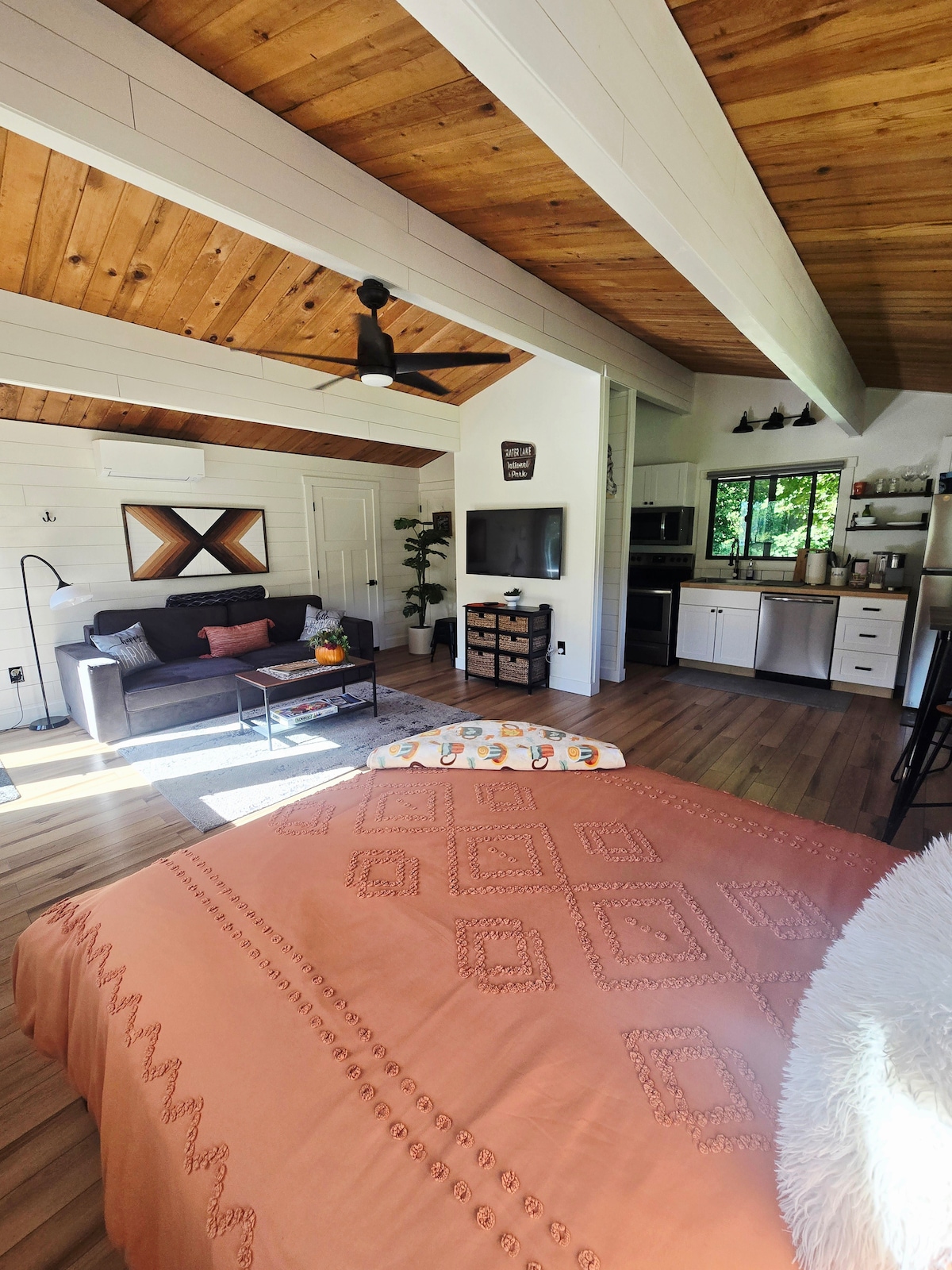 Remote lakefront retreat—boat access only. We provide all arrival details after booking. Tucked away on North Tenmile Lake, this peaceful mini-cabin is perfect for a romantic escape or quiet writer’s retreat. Features a full kitchen, full bathroom with shower/tub combo, loft with king bed and lake views. Enjoy a private dock, paddleboards, high-speed WiFi, fishing, stargazing, and morning coffee by the water. The perfect mix of peace, privacy, and nature.