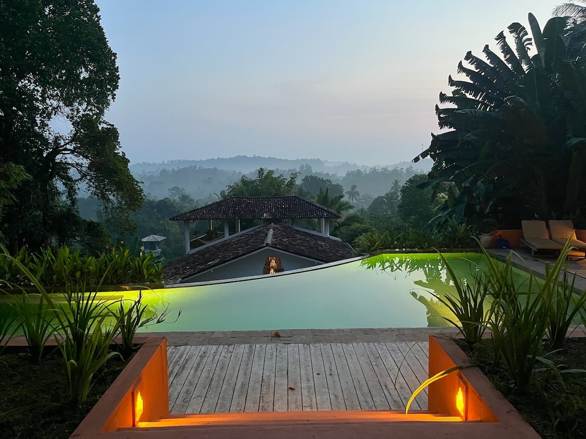 Nestled on a hilltop in Talpe, Galle - Thalagoya House offers you a peaceful setting to relax in whilst being well located to enjoy the area from. Just 20mins East to trendy Ahangama & 20mins West to the Unesco Galle Fort its ideally located. Local stunning beaches are a 4mins drive to Dalawella / Wijaya Beach and 8mins to Talpe Beach with its ancient rock pool jacuzzis. The house has 5 bedrooms with private bathrooms, open air dining room and large pool in mature gardens with incredible views.
