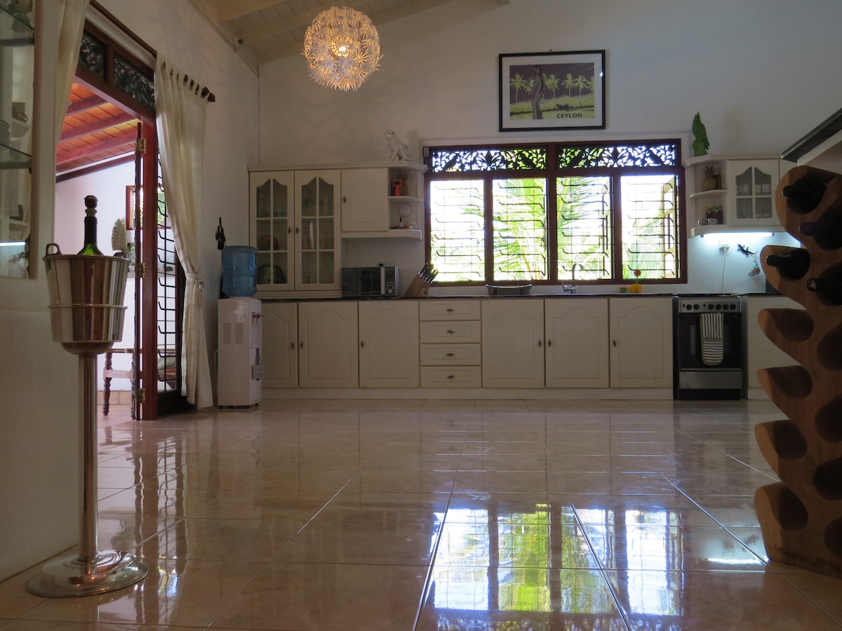 Private luxury villa & pool, AC, fans, generator, workspace Easy access to all Hikkaduwa has to offer Free high speed WiFi, Cleaning. Cable TV Sleeps 6 +baby Private Chef option 2 Superking 1 Kingsize bedrooms, 3 ensuite power shower rooms Spacious interior & shaded veranda outdoor living area Large sunny tropical walled garden Supported stay with Chef/Villa Manager & Driver on call Cleaning every 2 days, bedding/towels Peaceful neighbourhood 5 minutes to beach Airport transfers /Tours arranged