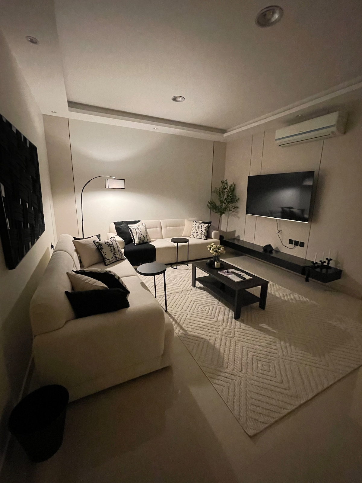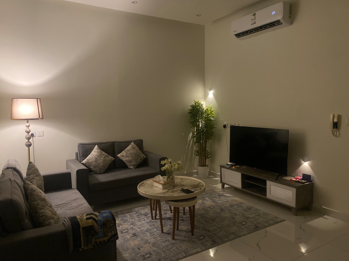 شقة هادئة وأنيقة بدخول ذاتي.. تتكون من صالة جميلة بذوق رفيع فيها شاشة ذكية 60 بوصه + WiFi يوجد مطبخ أنيق متكامل مجهز بكامل الأدوات لتلبية جميع احتياجاتك .. وغرفة نوم بسرير مزدوج مجهز بأجود المراتب .. ودورة مياه متكاملة الخدمات