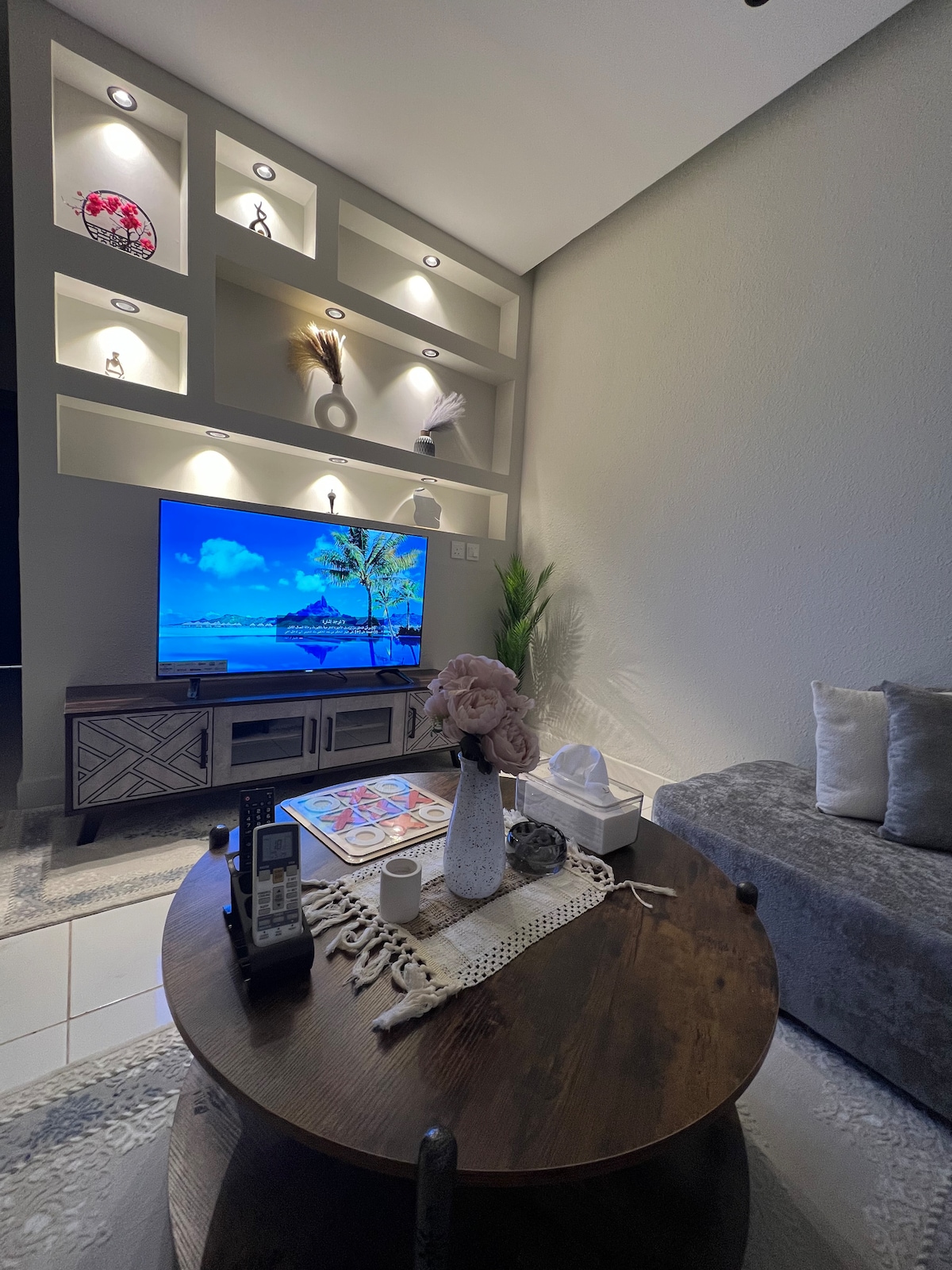 استمتع مع كامل العائلة في هذا المسكن الأنيق بدخول ذكي، المسكن مكون من ملحق خارجي وموقد نار وتلفاز، غرفة ماستر بسرير كوين مع تلفاز + غرفة بسريرين مفرد، مطبخ مجهز وانيق، ودورتين مياة مجهزة. ومساحة خارجية خاصة مع مغسلة يدين مناسبه لاعمال الشواء والعشاء في الهواء الطلق. متوفر Wi-Fi ، تكييف مركزي ، ويوجد سوبرماركت قريب ومتوفر توصيل.