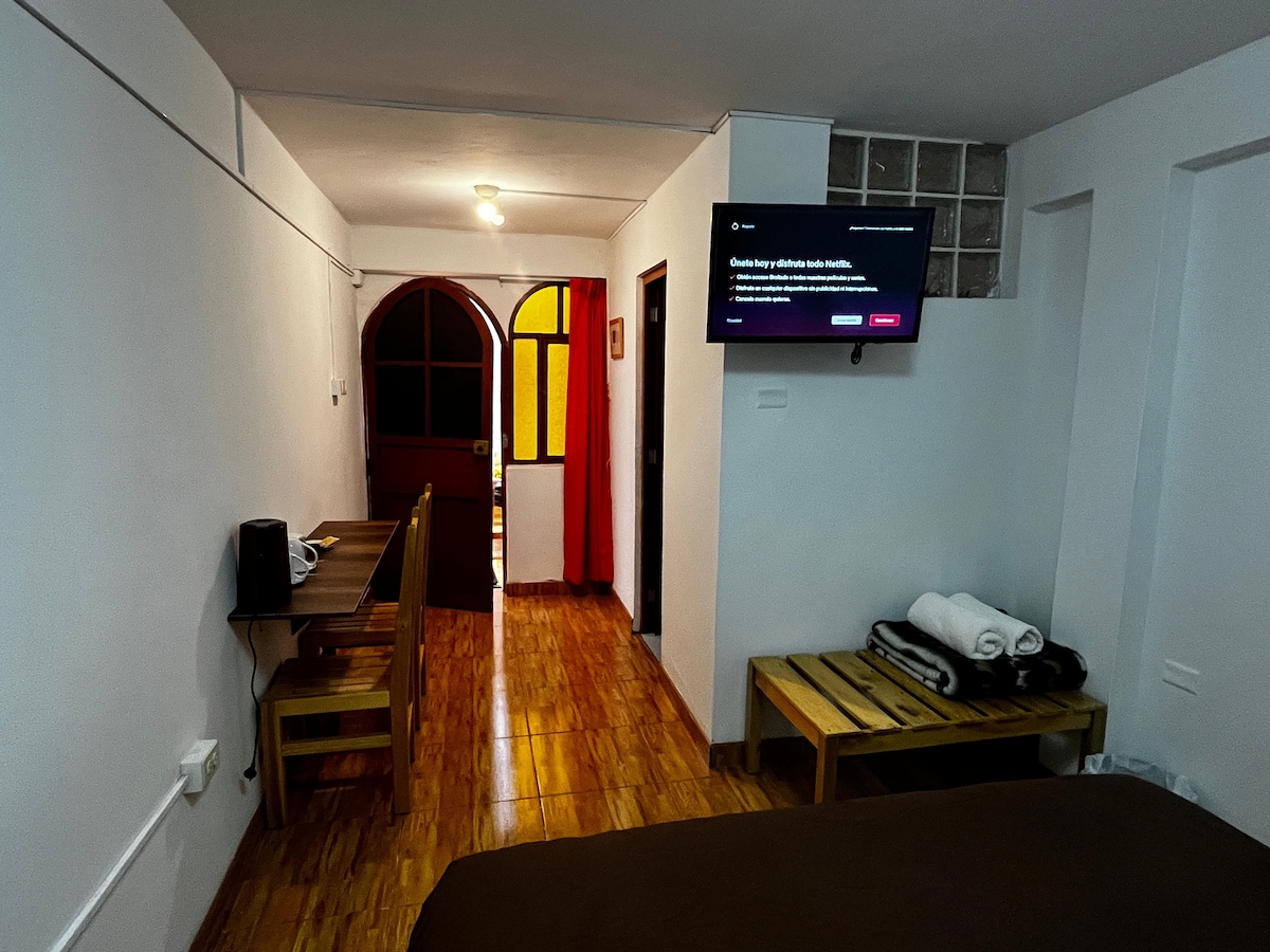 El departamento es de uso exclusivo para los huéspedes, se encuentra en el primer piso, la habitación tiene baño propio, podrás disfrutar de la calidez de este alojamiento muy tranquilo y céntrico a solo 3 cuadras de la plaza de armas. Puedes acceder a la cocina, sala, comedor y baño. Dispone de agua caliente en las ducha y cocina. Ideal para largas estancias.