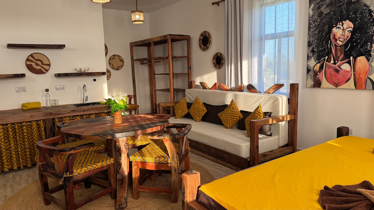 PROPERTY WITH BACK UP GENERATOR IN CASE OF ELECTRICITY CUT!Welcome to our beachfront apartment with Italian and Swahili style. It features a spacious kitchen, luxurious bedroom with king-size bed, ensuite bathroom, AC, private beach entrance, charming garden. Enjoy 24-hour internet, security, and a sofa bed for extra guests. Contact us for availability. Unforgettable stay guaranteed. Oh yes, we are now offering FULL BREAKFAST and COWORK ACCESS included in the price!!