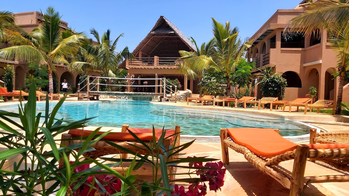 Our property is the ideal oasis for your African holidays, located in the northern part of Kiwengwa Located just at 150 meters from the magical beach of Kiwengwa, our place offers fully equipped apartments surrounded by tropical gardens with a wonderful pool -The apartments are furnished with AC comprising a seating area with a sofa, a dining area, and an equipped kitchen. - Our private beach equipped with humbrellas and sunbeds is included in price - Service of breakfast: 10 USD per person
