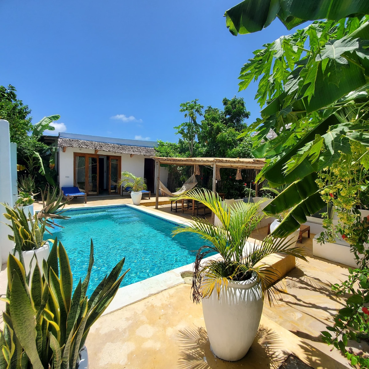 * Villa is private, it has it's own private pool and nothing is shared* Escape to our unique and stylish Bali inspired retreat, nestled amidst the breathtaking beauty of East Nungwi. A place far away from the crowds, where every detail harmonizes with nature. Wake up to the majestic sight of the sunrise, as you find yourself cocooned in lush greenery. Take a plunge into our private pool or simply relax in the midst of this picture perfect paradise. Come, experience the magic of Zanzibar.