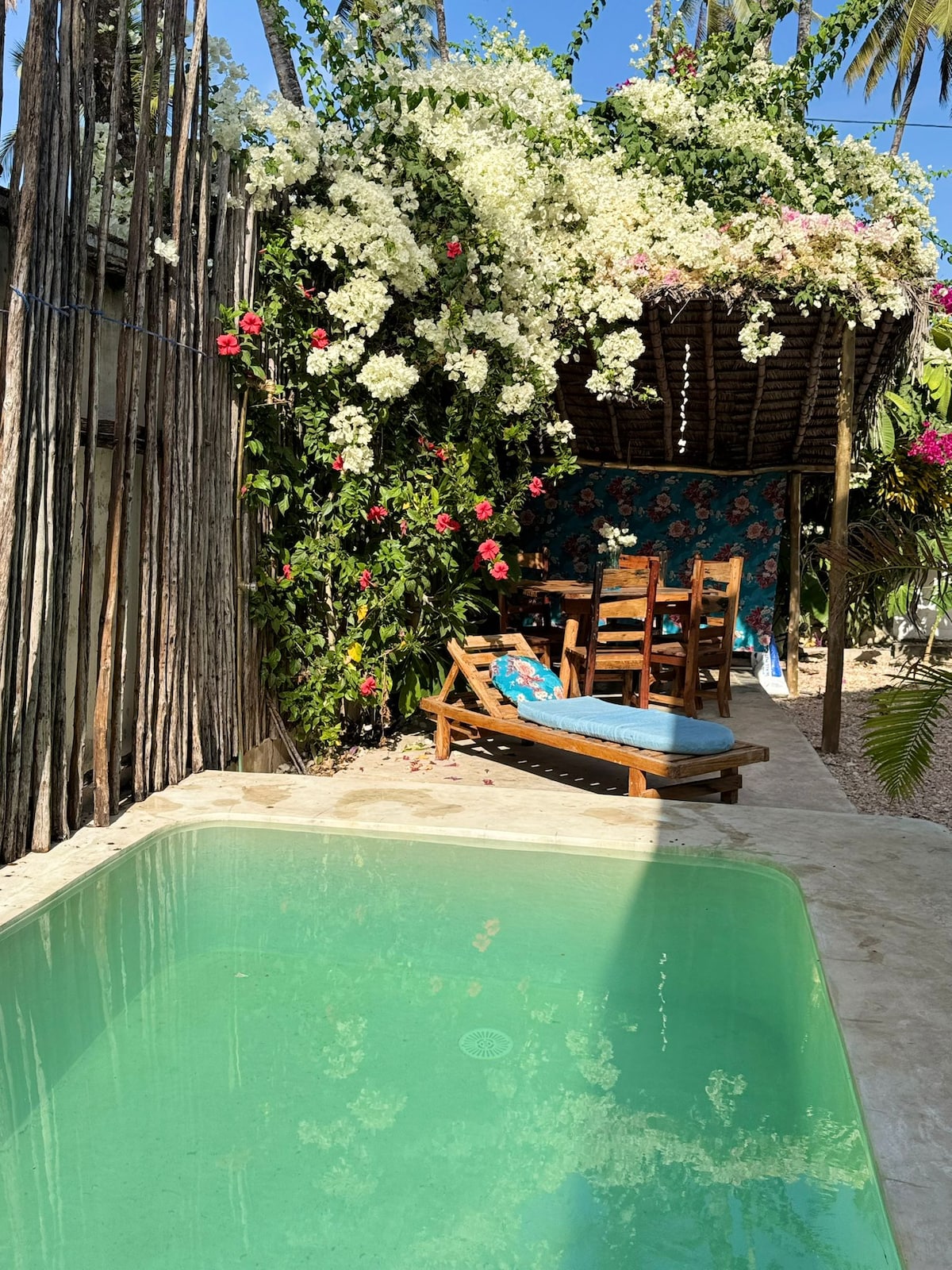 We have beautiful a house in Bwejuu . The House is in the first line , we have private pool . In addition, there are 3 large swimming pools and a restaurant The house is big: 2 bedrooms 2 bathrooms 3 toilletes Living room and kitchen (The kitchen is equipped with an oven, fridge,dishes,cutlery, blender, etc 2 Terraces AC Generator ( when the generator is running you have water, light, refrigerator, ceiling fans and a fridge,wi fi and charging socket) . African style deco is in the house