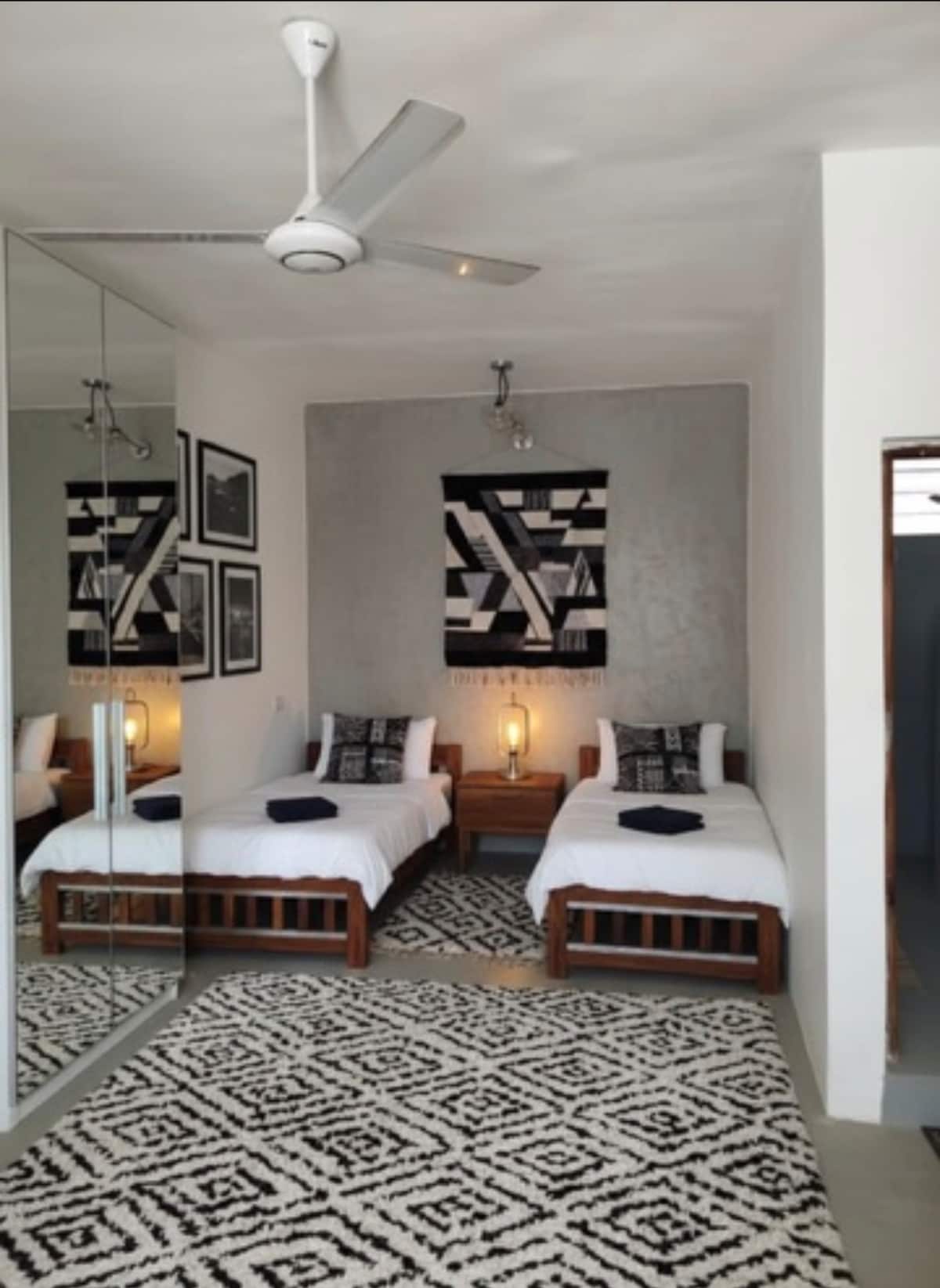 Comfortable and cozy room with independent entrance , ceiling fan and air condition, fully furnished, in a villa with infinity swimming pool (for swimming and relaxing) located at 1 minute walking from the beautiful, white, sandy beach of Paje, one of the best spot of Zanzibar island for its beach/sea, its night life, its sport activities (kitesurf in particular). We will be more than happy to host you! See you soon in Paje!