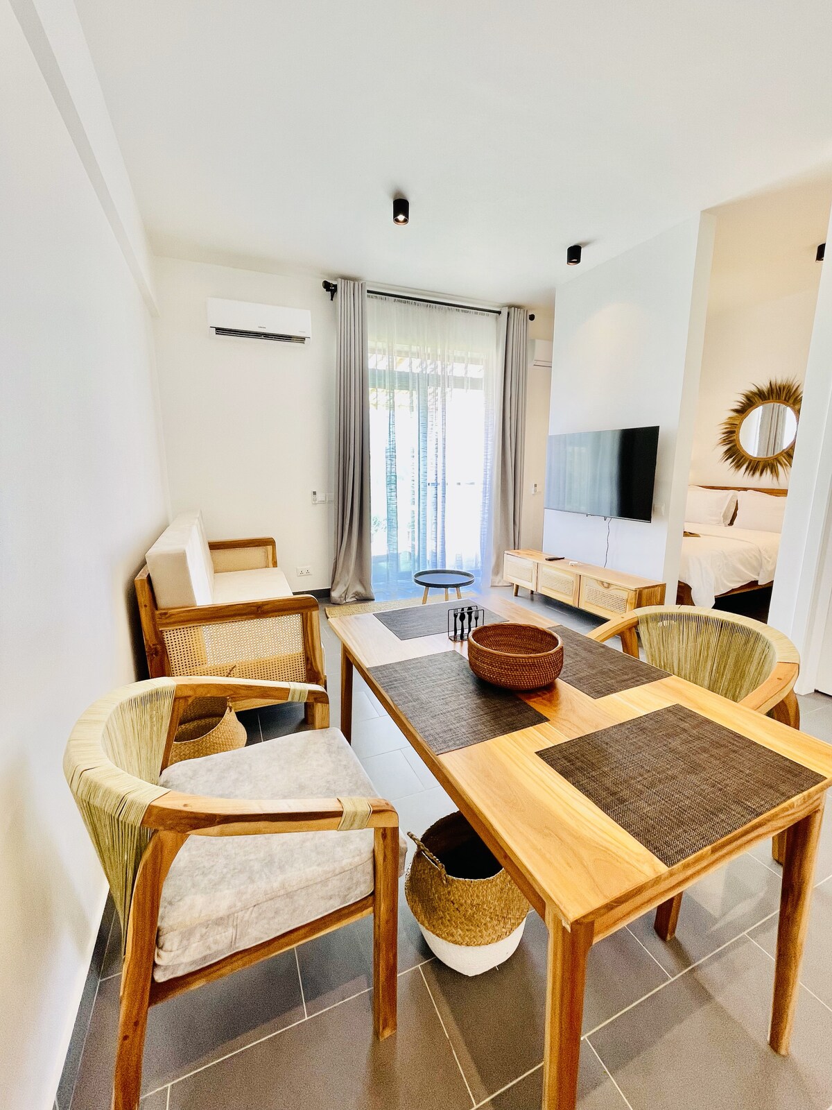 Wake up to the gentle sound of waves and turquoise water stretching out from your own private balcony in this bright, airy 2-bedroom apartment on Uroa Beach. Inside, you’ll find a spacious open-plan living and dining area, a fully equipped kitchen for home-cooked meals, two comfortable bedrooms with AC and large windows, and modern bathrooms. Step through the sliding doors and you’re just moments from soft white sand and calm Indian Ocean waters.