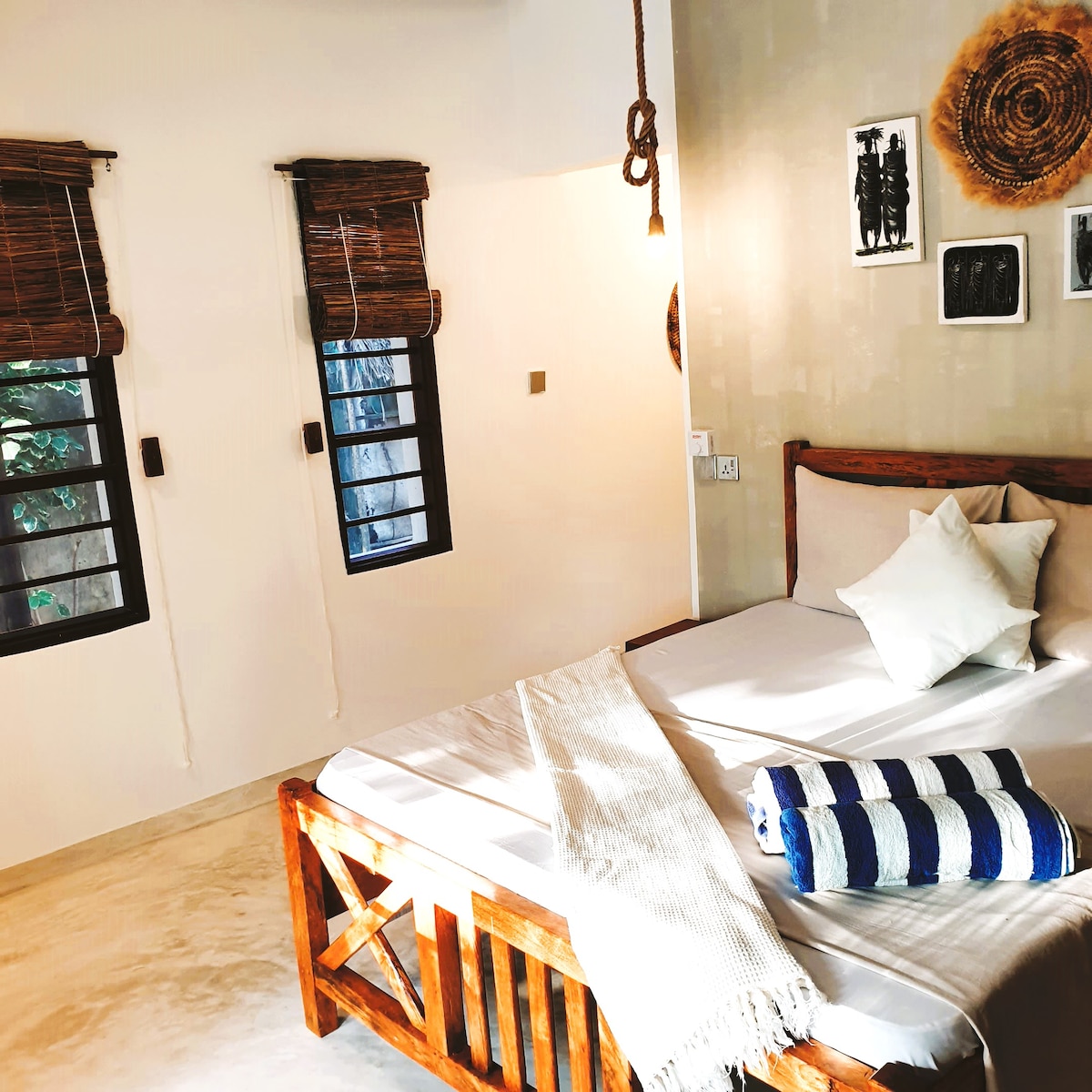 Vergiss deine Sorgen und entspanne zu zweit, mit Freunden oder mit der ganzen Familie in dieser friedlichen und ruhigen Unterkunft am Dorfrand von Bwejuu. Das Haus liegt auf einer kleinen Anhöhe und verfügt über einen herrlichen Meerblick. Der traumhafte, noch sehr unberührte und authentische Bwejuu Strand ist nur 5 Gehminuten entfernt, genau so wie die Hauptstraße mit einigen kleinen Shops und Streetfood Ständen. Paje Stadt erreichst du in weniger als 10 Min mit dem Auto/Taxi/Bus.