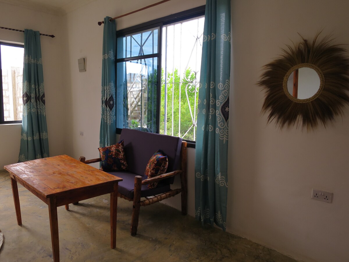 Welcome to our cozy Airbnb in Michamvi, where comfort meets island charm. Relax on the spacious wooden patio set, perfect for morning coffee or evening chats. Inside, enjoy a beautifully made bed with vibrant local fabrics and thoughtful towel art, prepared by our caring housekeeping team. The serene setting, bright spaces, and attention to detail make this a peaceful retreat just minutes from the beach. Forget your worries in this spacious and serene space.