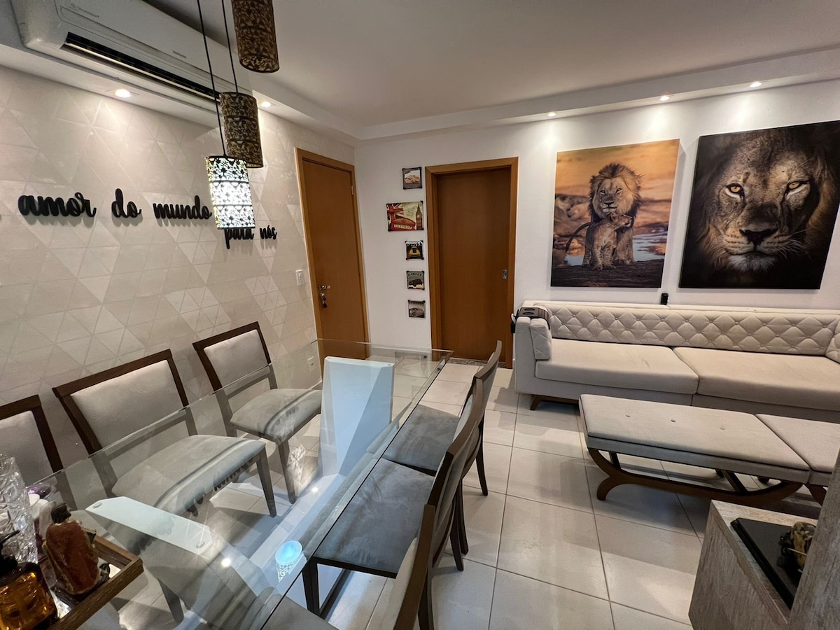 Apartamento com dois quartos, ambos com ar condicionados, ventiladores de teto e dois banheiros, sendo uma suíte. Incluso roupa de cama e banho. *Sala de estar com sofá, tv e ventilador de teto. *Cozinha equipada com fogão, geladeira, microondas, cafeteira, utensílios de cozinha. *Área de serviço com máquina de lavar. *Área de lazer com piscina e quadras de esportes. *Duas vagas de garagem cobertas. *Localizado próximo às principais universidades, mercados, farmácias, shopping, restaurantes...