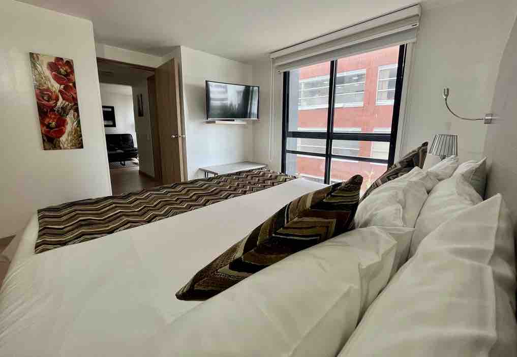 Luxury one bedroom in the most exclusive / safe area of Bogota (Chico) within walking distance from the best restaurants, shopping centers and close proximity to many businesses. Executive level accommodation with dedicated workspace, private terrace, automatic fireplace, reliable WiFi, private parking and building security. Ameneties: Enjoy the beautiful panoramic terrace with fireplace and outdoor grill. Also play squash and relax in the sauna or steam room.