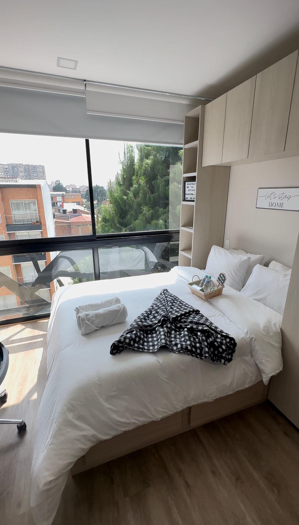 Vive Bogotá desde las alturas Disfruta nuestro elegante apartamento en el corazón de Chapinero, en el edificio más icónico de la zona. Su diseño de urna de vidrio ofrece vistas únicas de los Cerros Orientales, el Parque de los Hippies y la Carrera 7. Ideal para estancias cortas o largas, combina confort, estilo y ubicación privilegiada. A pocos pasos te espera la mejor escena gastronómica: restaurantes de autor, cafés de especialidad y bares llenos de vida.